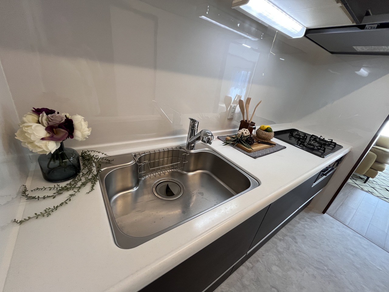 人工大理石を使用したシステムキッチン。永く傷つきにくく、お手入れもしやすい高機能性です。