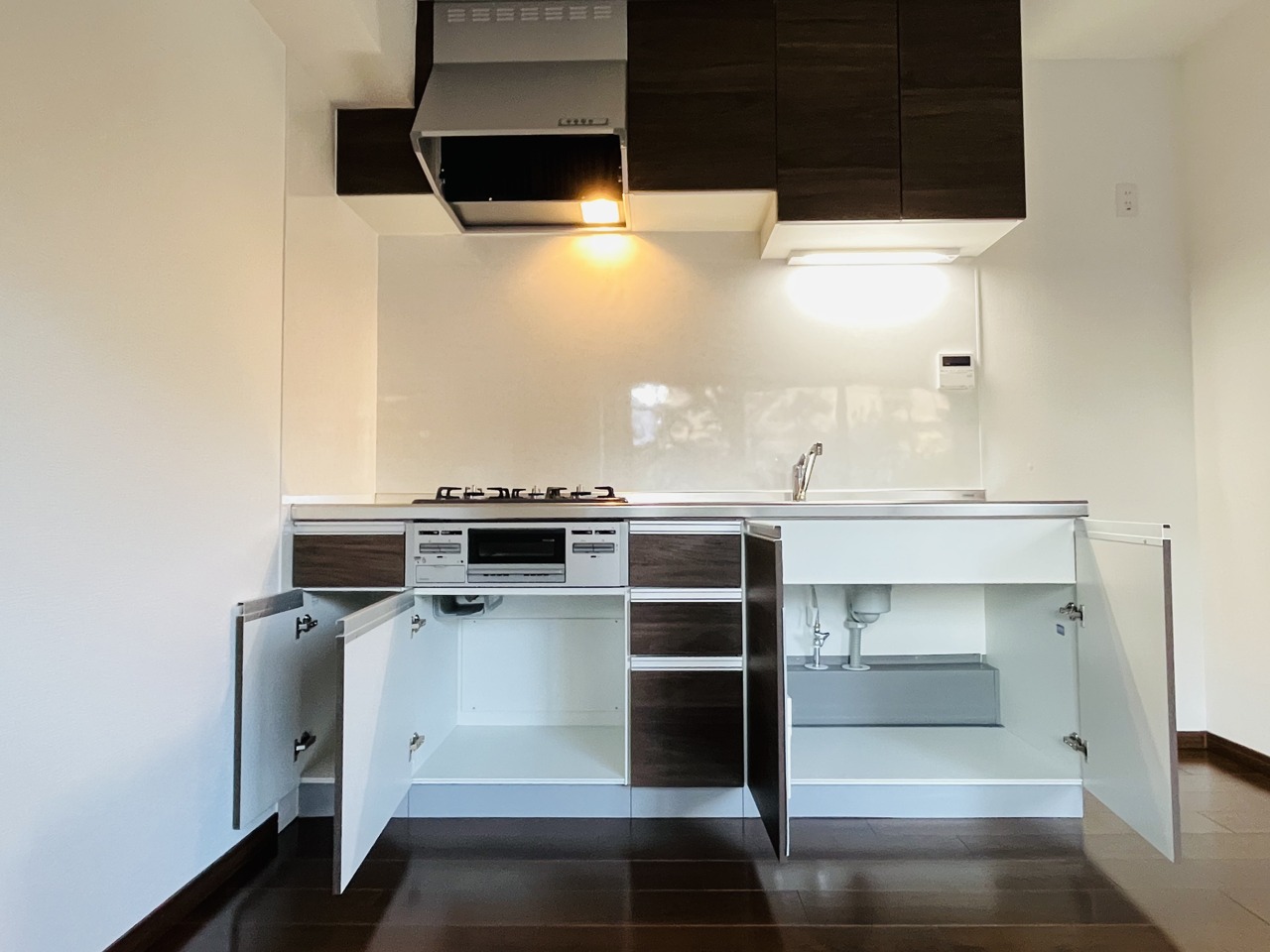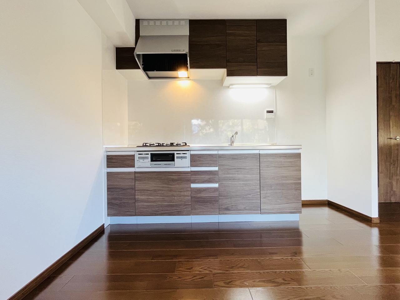 手を伸ばせばそこに収納が。安定した使用感の吊戸棚つきのキッチン空間。