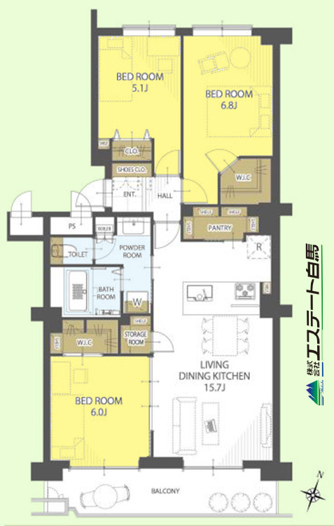 | 間取 | 3LDK (洋室6.8帖、洋室6帖、洋室5.1帖、LDK15.7帖) | ||