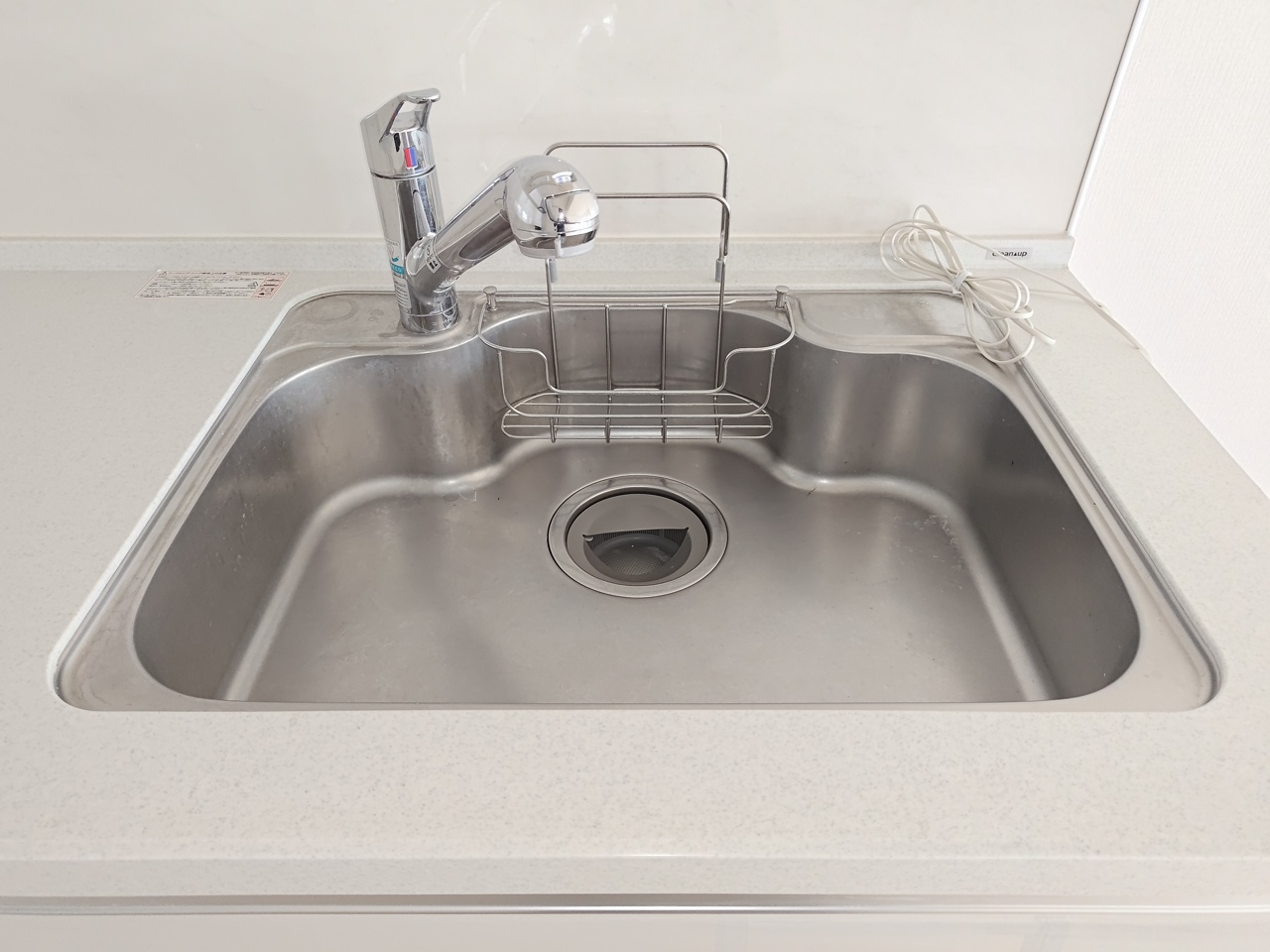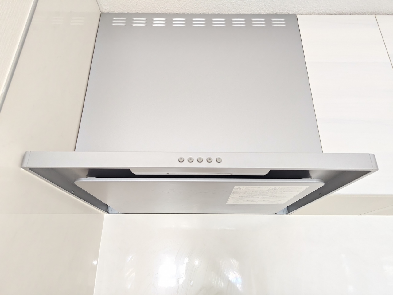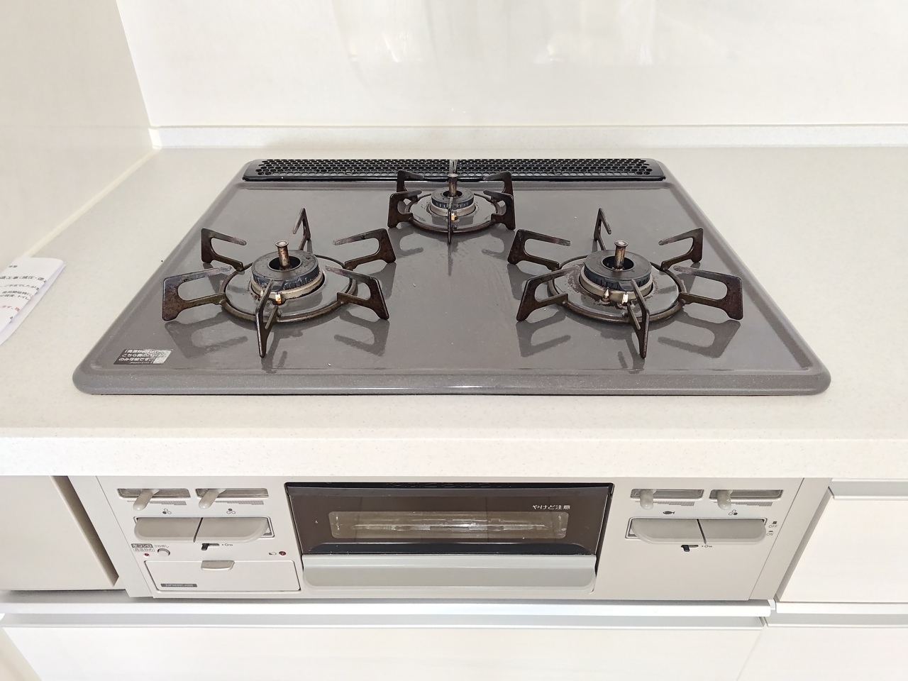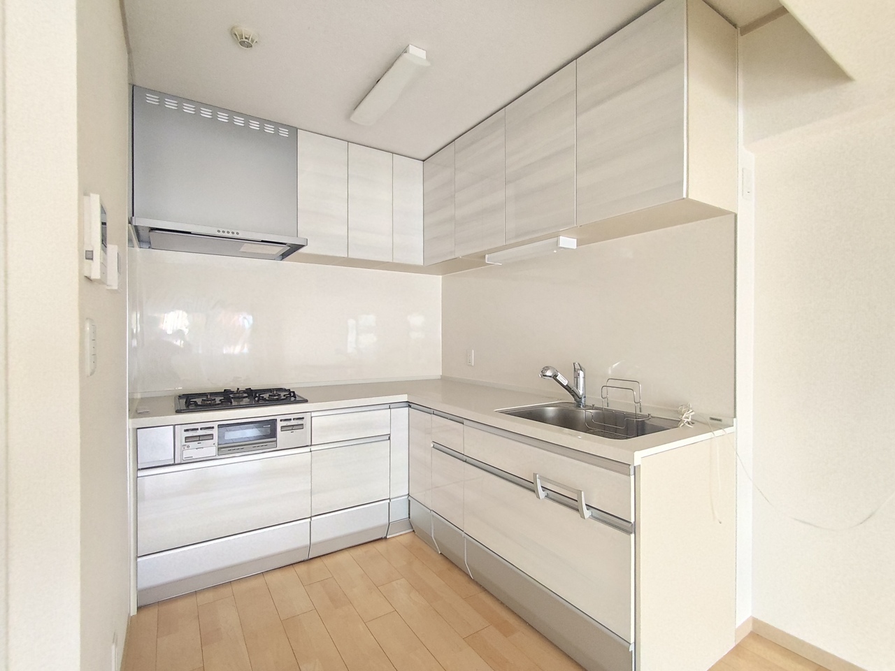 壁付けのL字型システムキッチン。 調理時の移動が少なく、効率的なキッチンです。