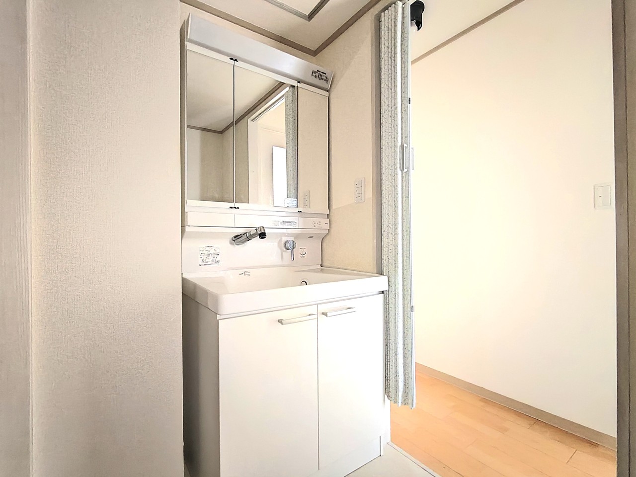 収納付きの洗面化粧台。鏡の裏側も収納棚になっています。