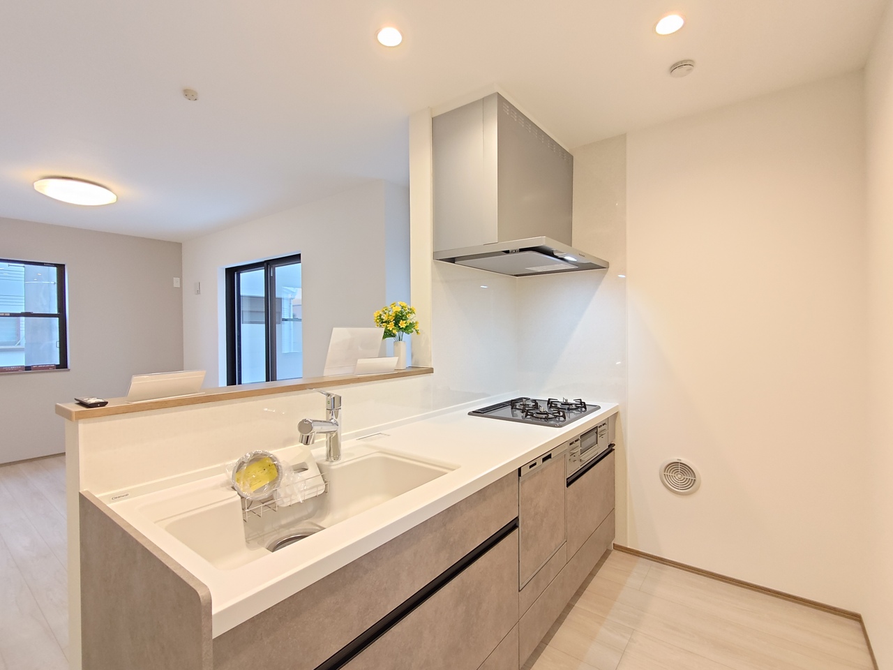 対面式のシステムキッチン。 調理しながらでも家族の様子を見守れる為、子育て世帯にもオススメです。