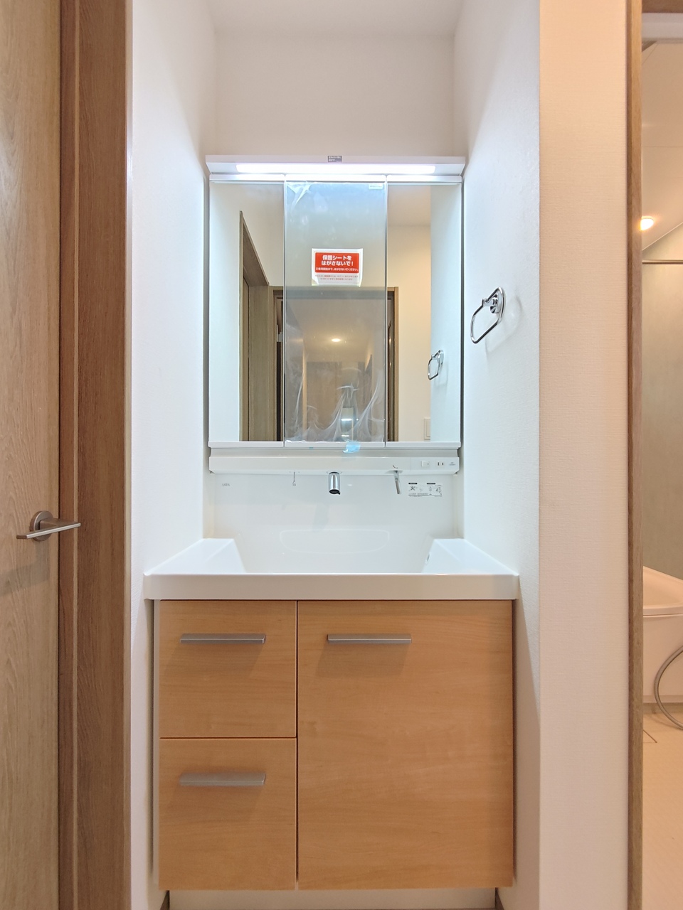 収納付きの洗面化粧台。鏡の裏側も収納棚になっています。
