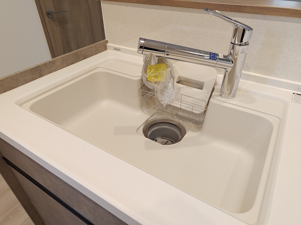 人工大理石のキッチンシンクは水垢が目立たず、オシャレな見た目を保つことができます。