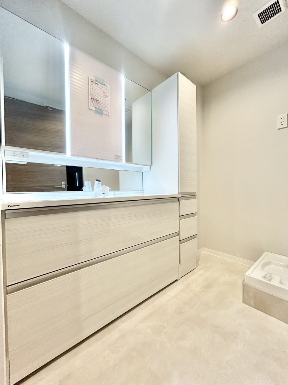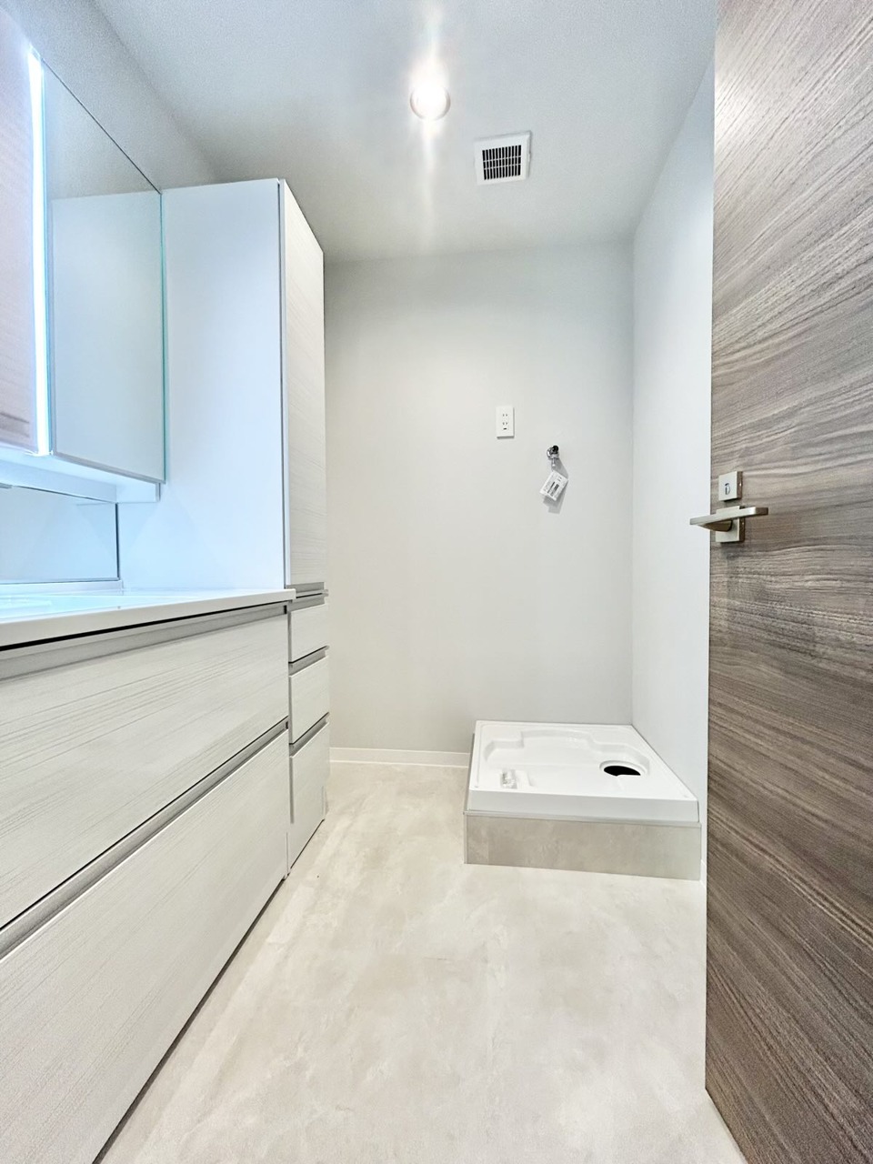 洗面化粧台は清潔感の漂うホワイトをベースカラーに、シンプルなデザインで。