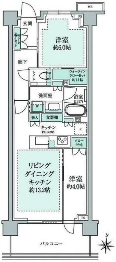 | 間取 | 2LDK (洋室6帖、洋室4帖、LDK13.2帖) | ||
