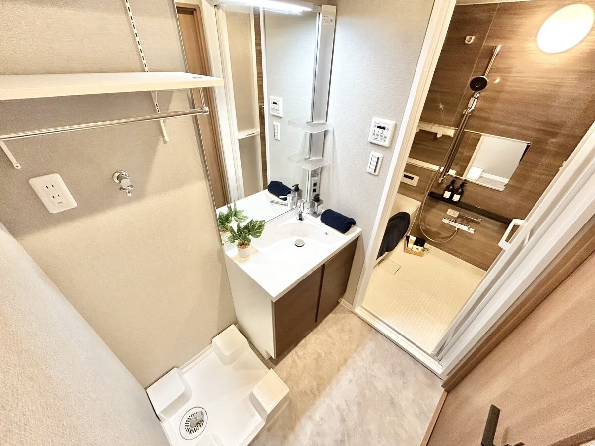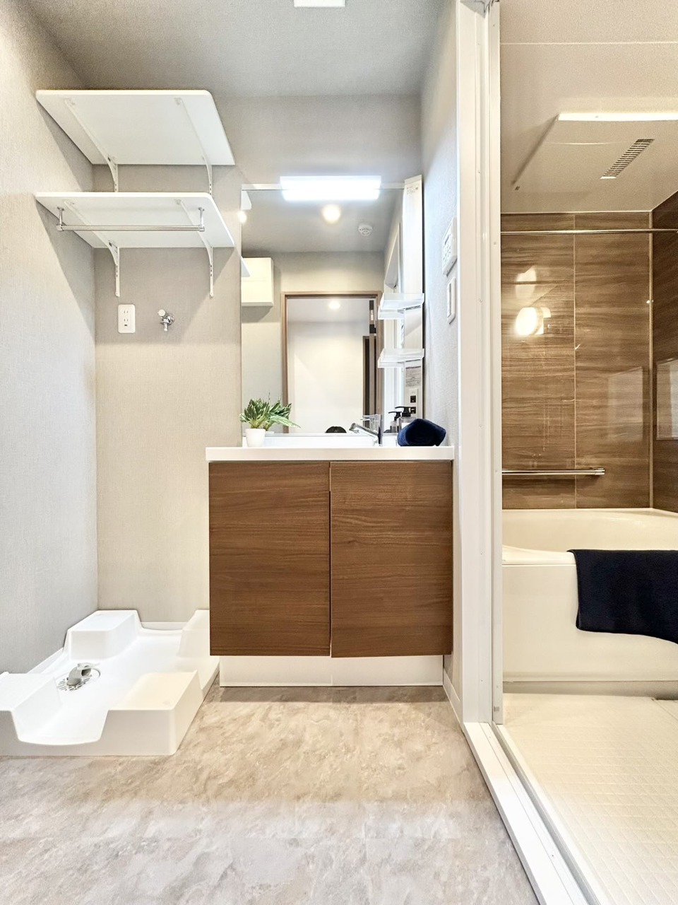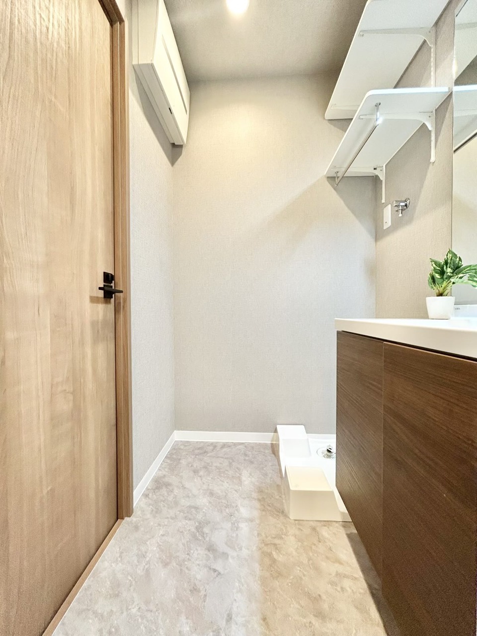 洗面台横にランドリーコーナーもゆったり。ドラム式洗濯機も置けそう。