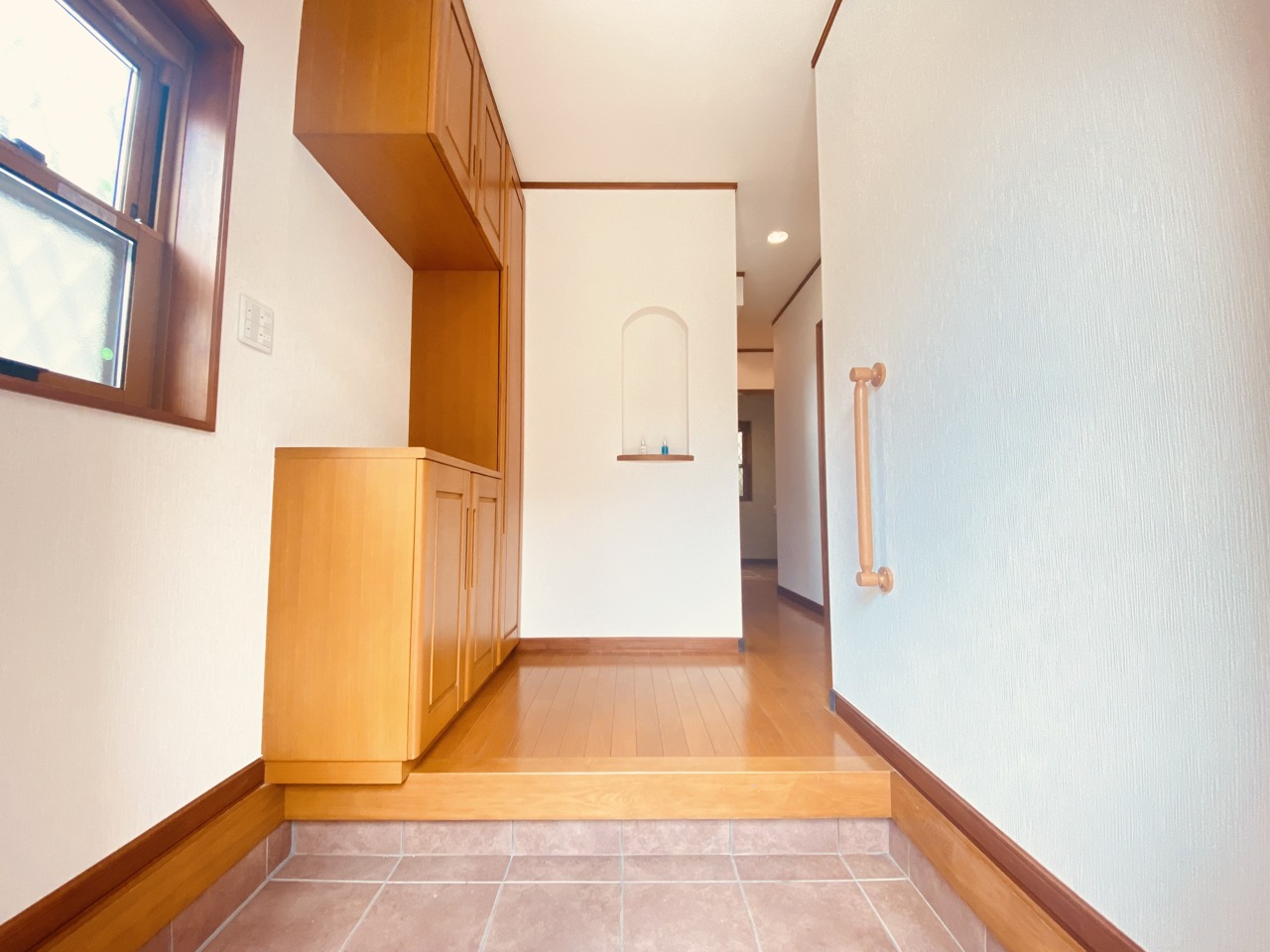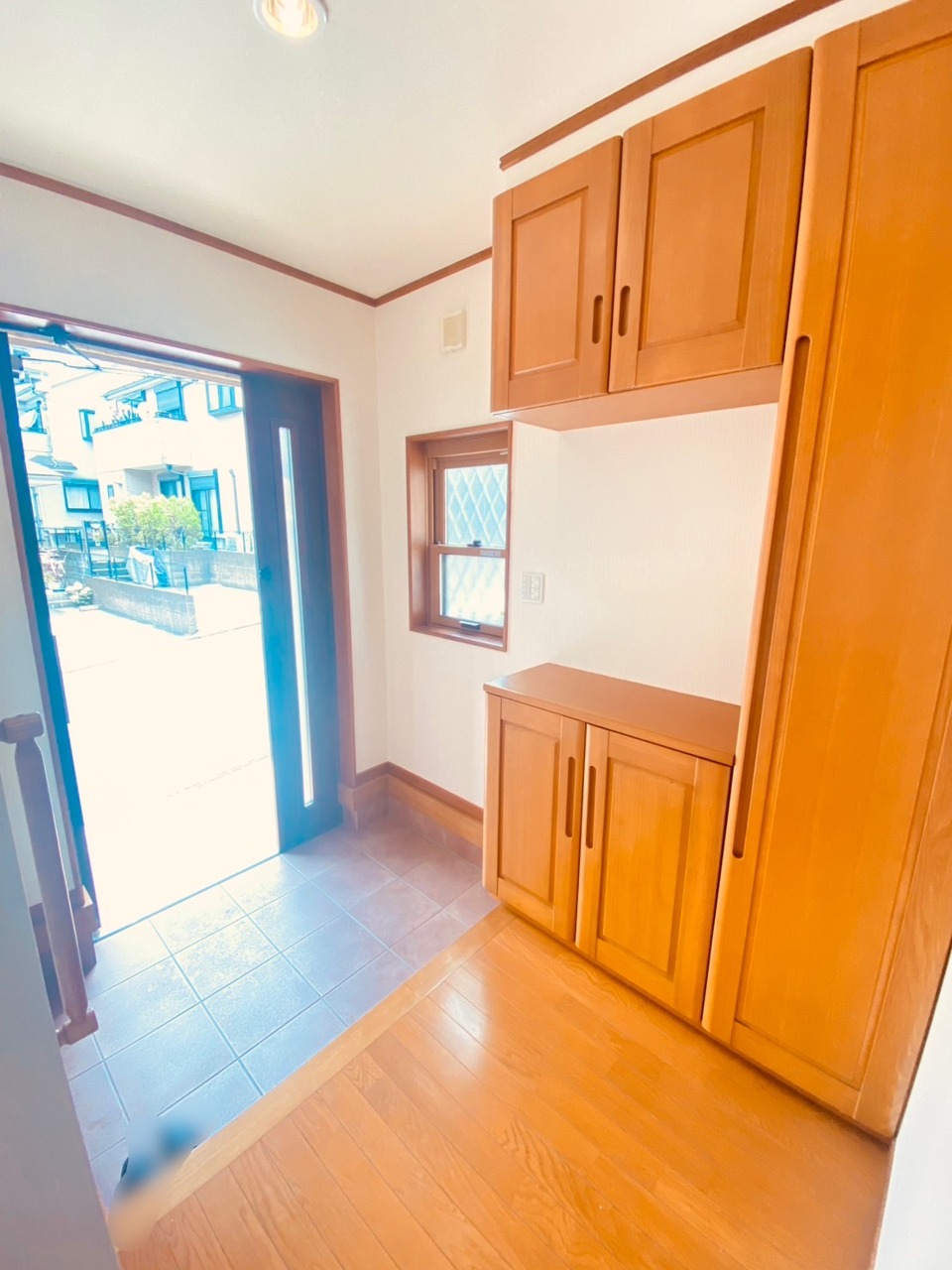 明るく開放的な玄関、靴の脱ぎ履きもしやすく、収納も豊富でご家族皆様の靴をスッキリ収納できます。
