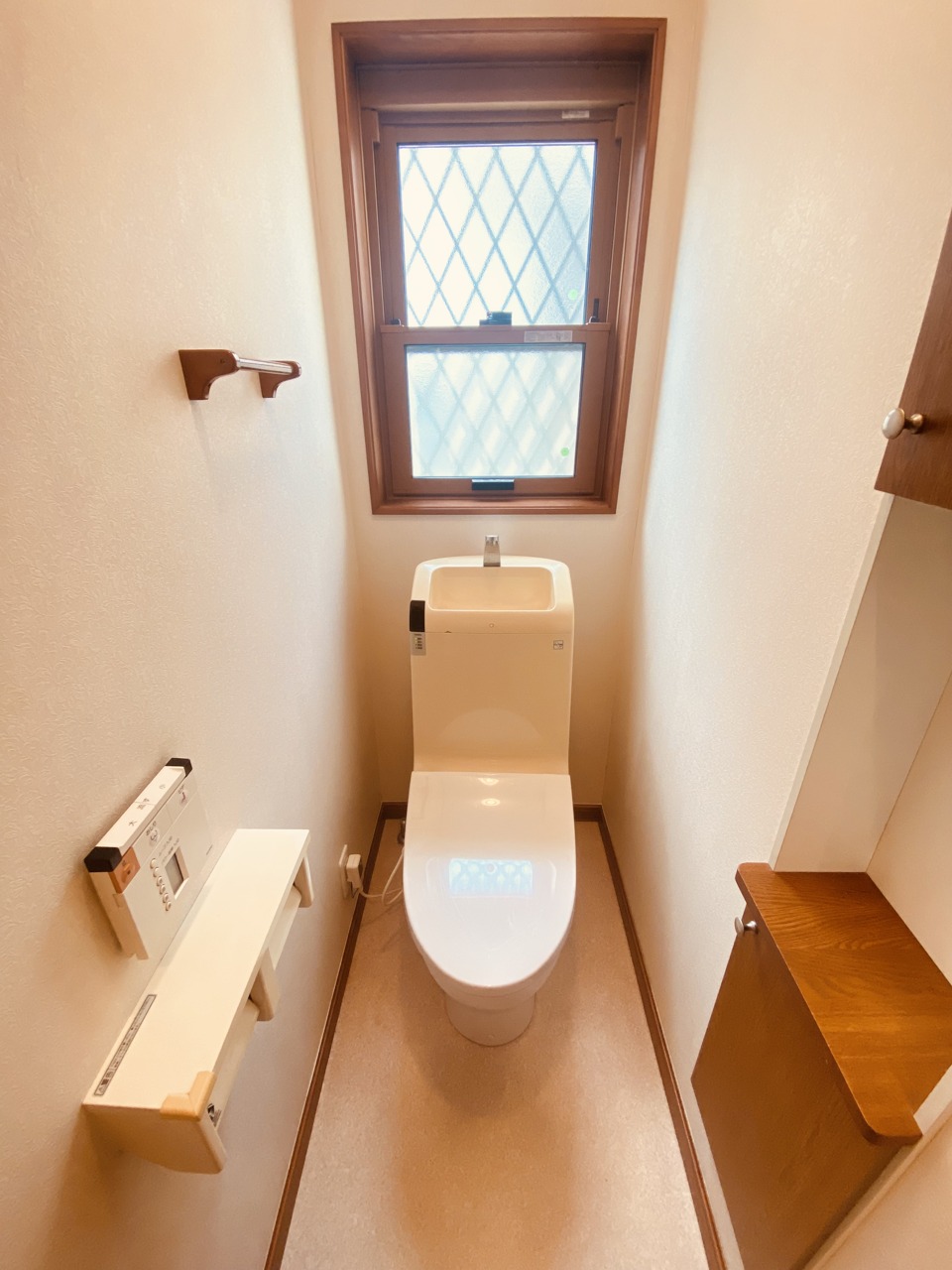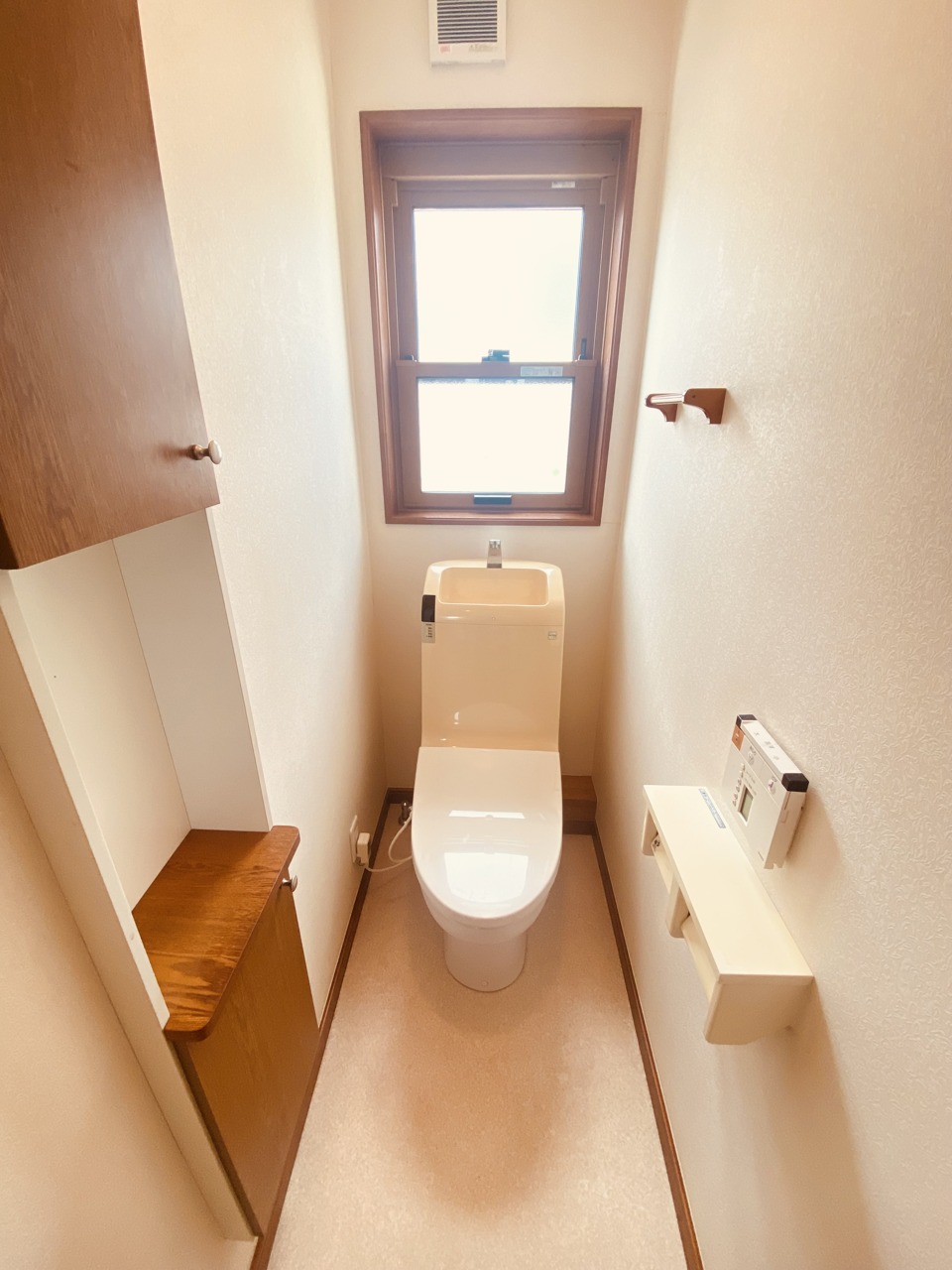 ウォシュレット機能付きのトイレ。換気のしやすい窓付きで、収納もあり実用性も兼ね備えた造り。