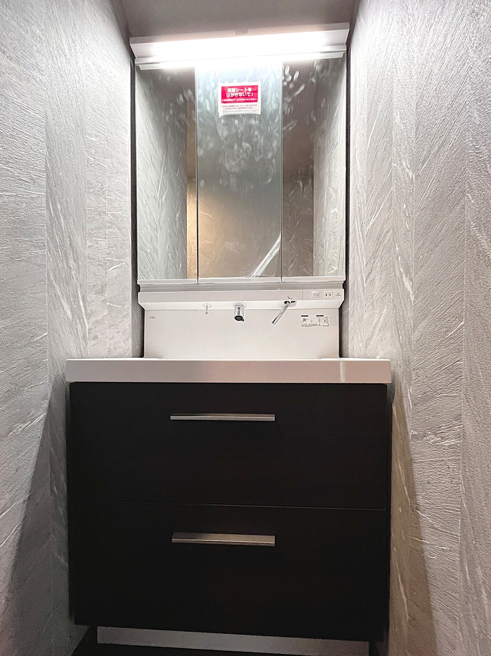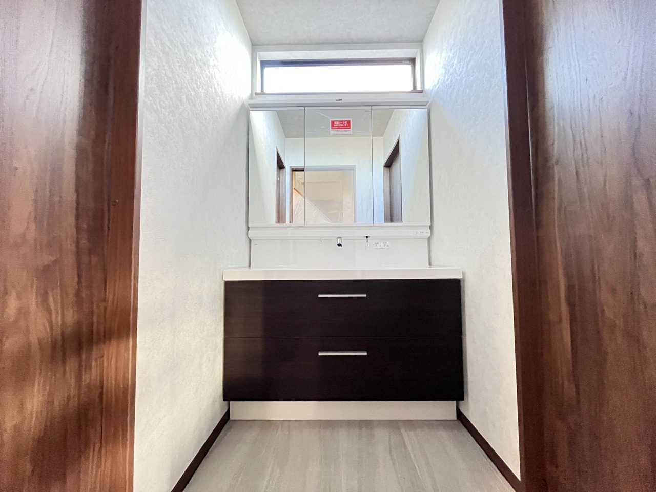 生活感を排除した洗面室。お出かけ前の身だしなみに一歩差がつく三面鏡。ミラー裏にはたっぷり収納もございます。
