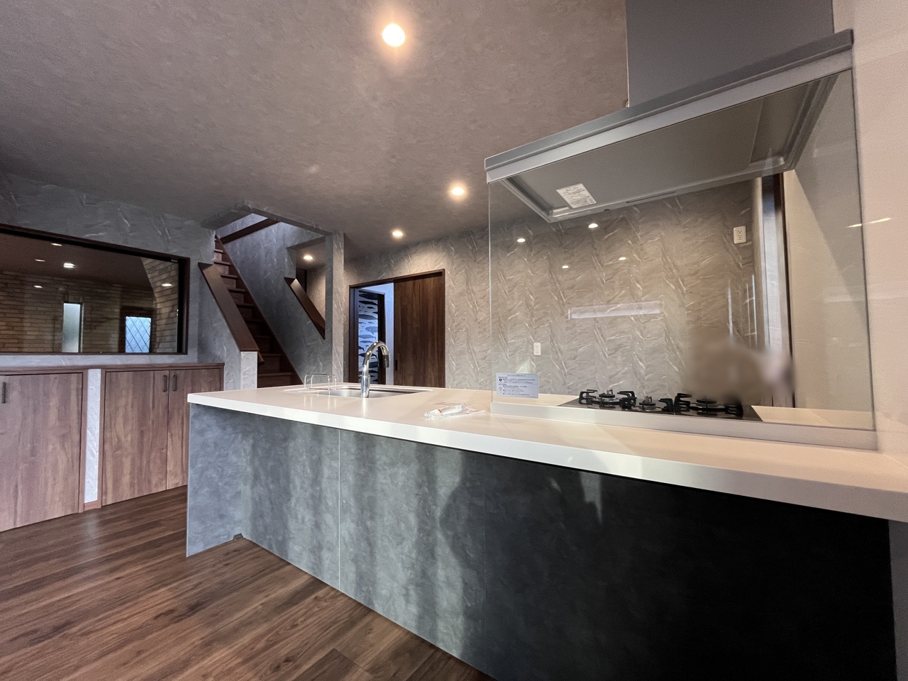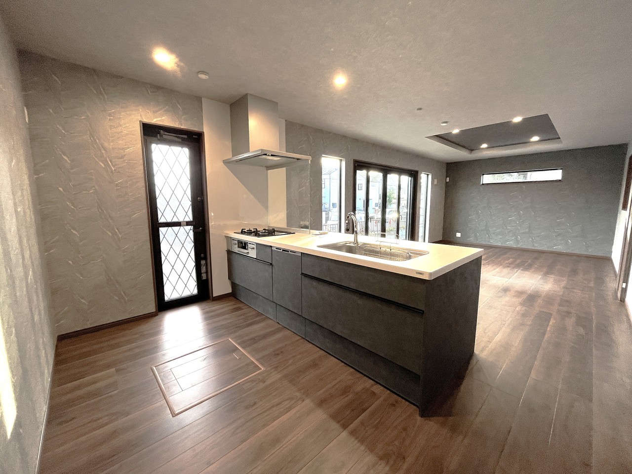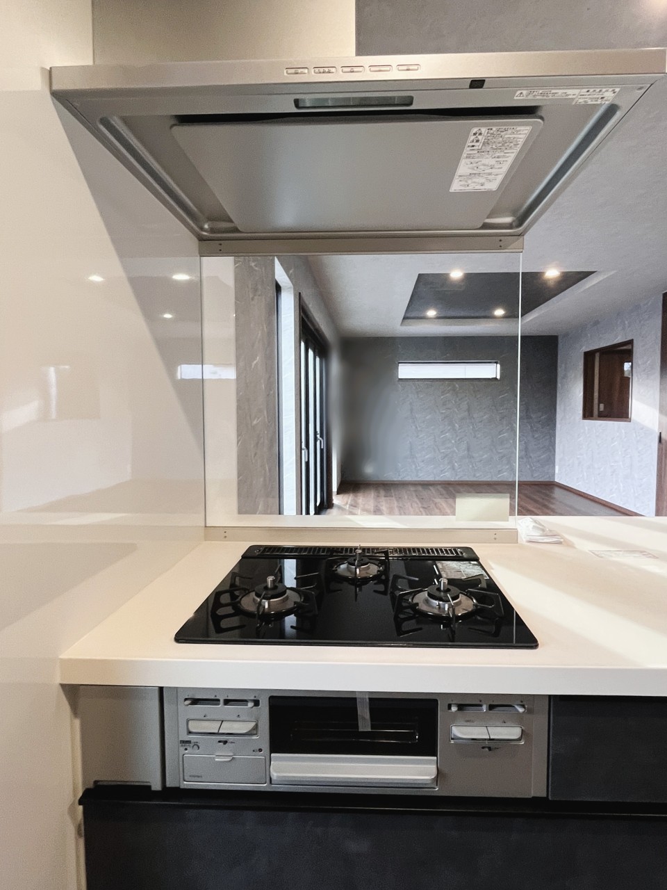リビングにいる家族の顔が見渡せるカウンターキッチン。お料理もより一層おいしく、楽しく。食器棚を背面に設置しても十分な広さを確保しています。