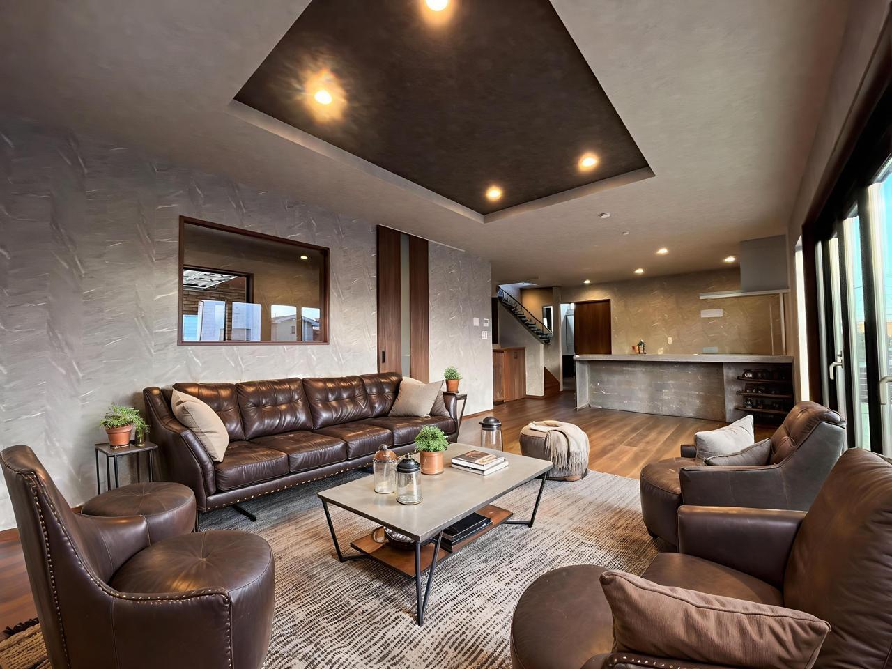 床暖房がある明るいリビングは、設計士の心遣いが感じられるガレージが覗けるフィクスの窓の配置。リビングイン階段は家族の気配を感じられます。