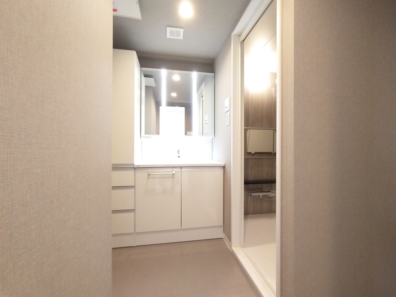 たっぷりの収納を設けたシャワー付洗面台で快適な暮らし。