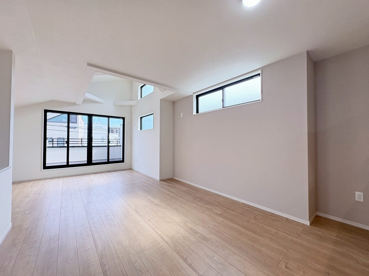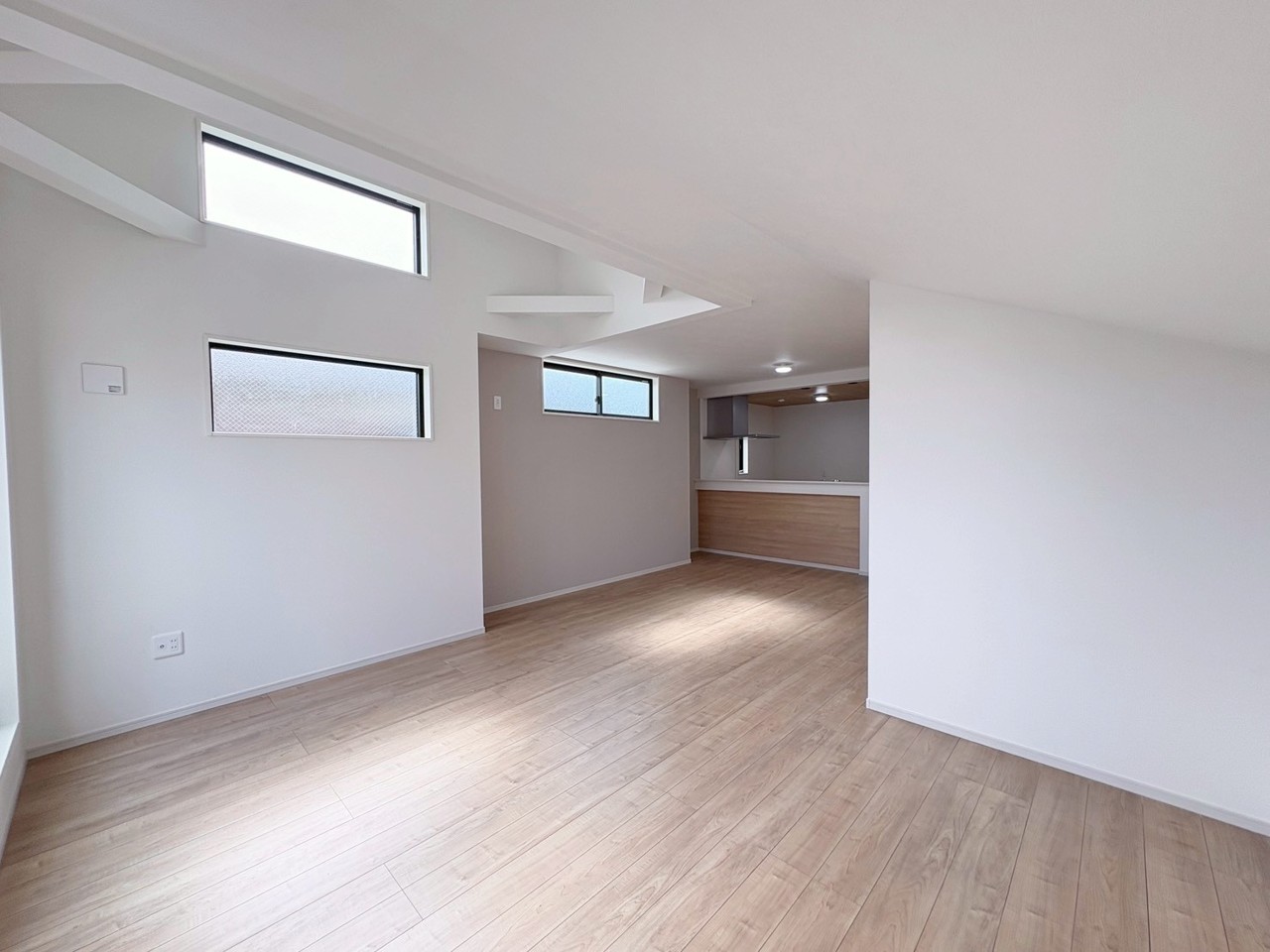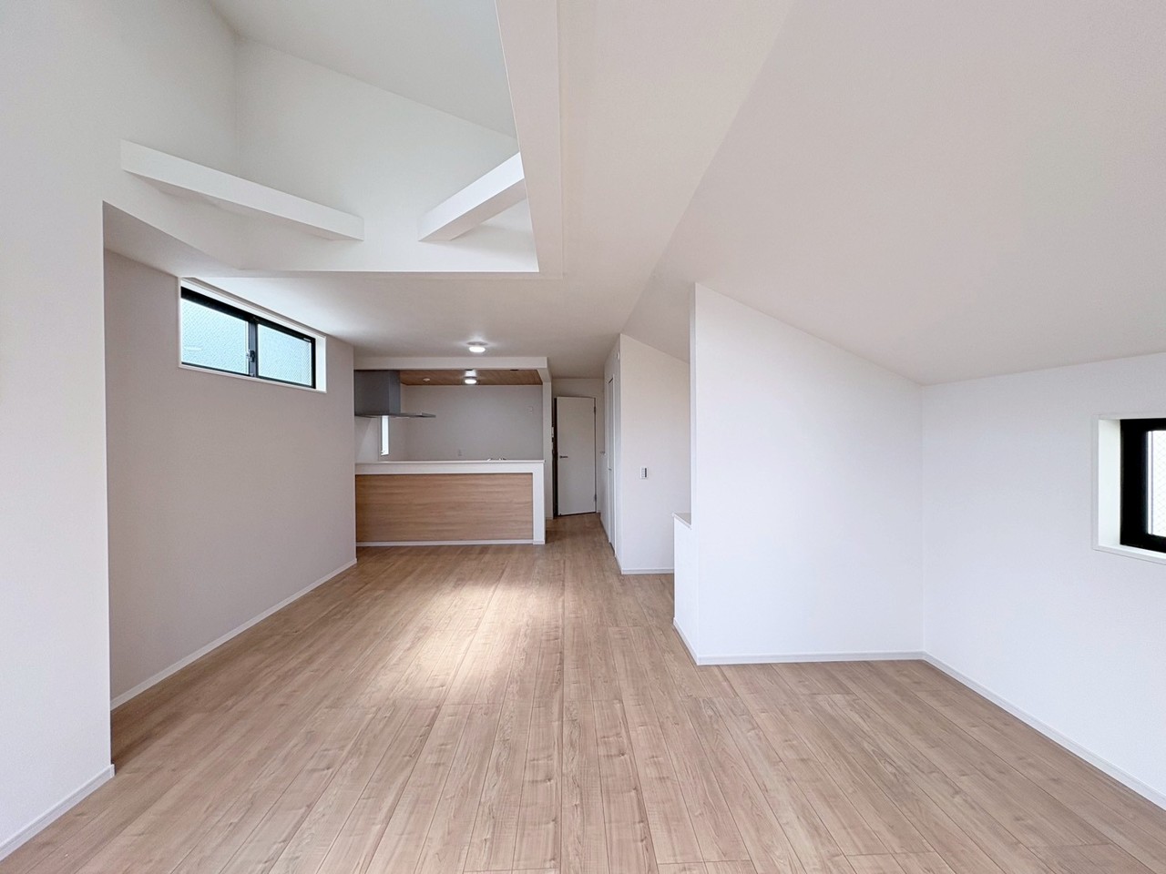 リビング20帖、勾配天井と吹抜けのある開放的な空間設計。床暖房や食器洗浄乾燥機、浴室暖房乾燥機など設備も充実してます。