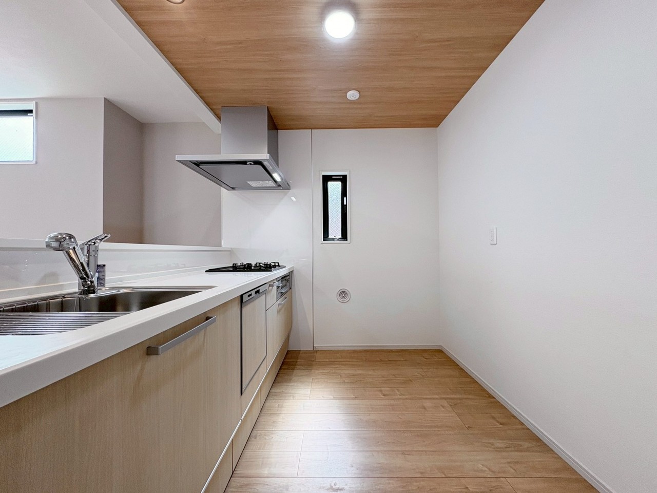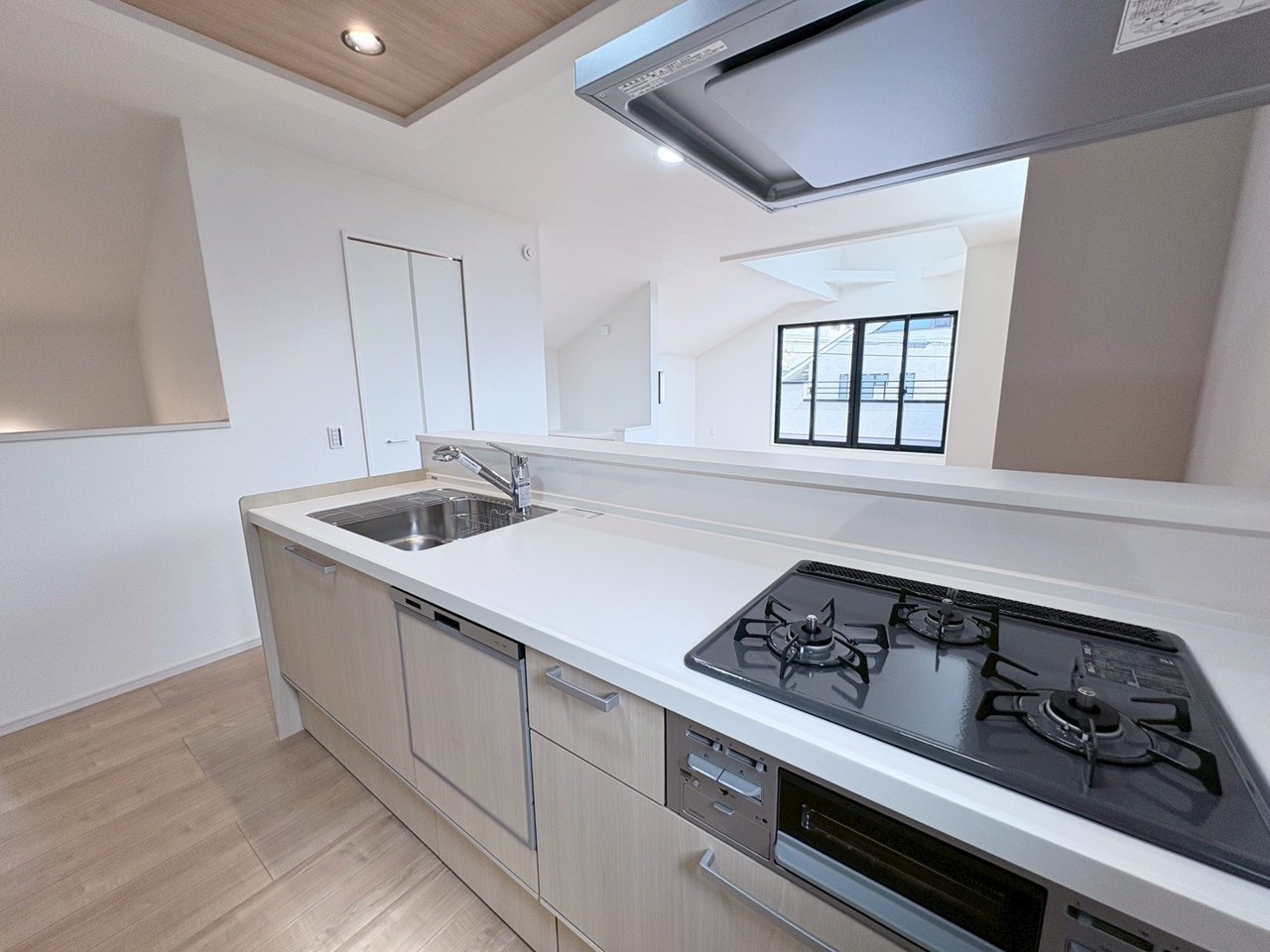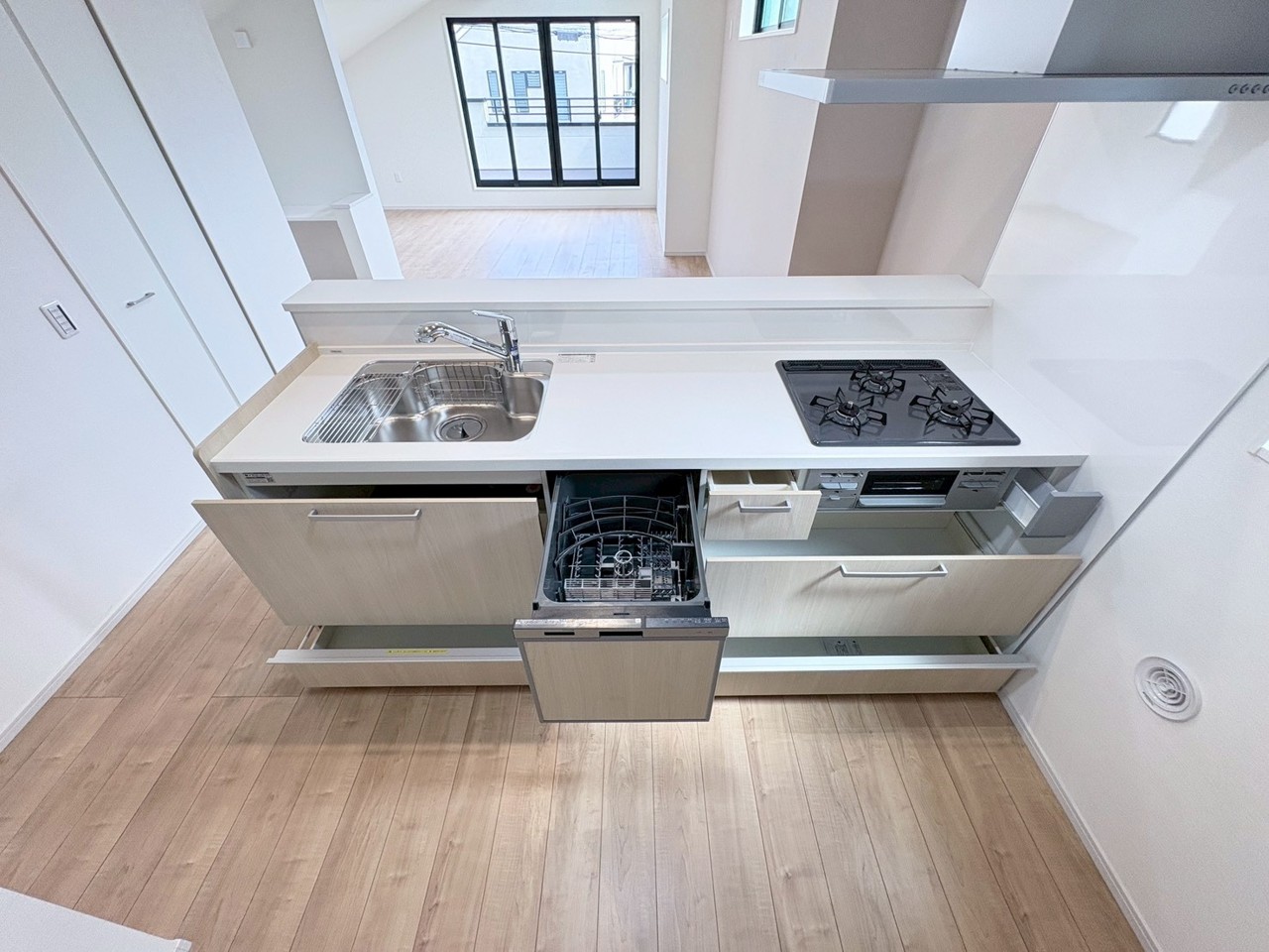 リビング20帖、勾配天井と吹抜けのある開放的な空間設計。床暖房や食器洗浄乾燥機、浴室暖房乾燥機など設備も充実してます。