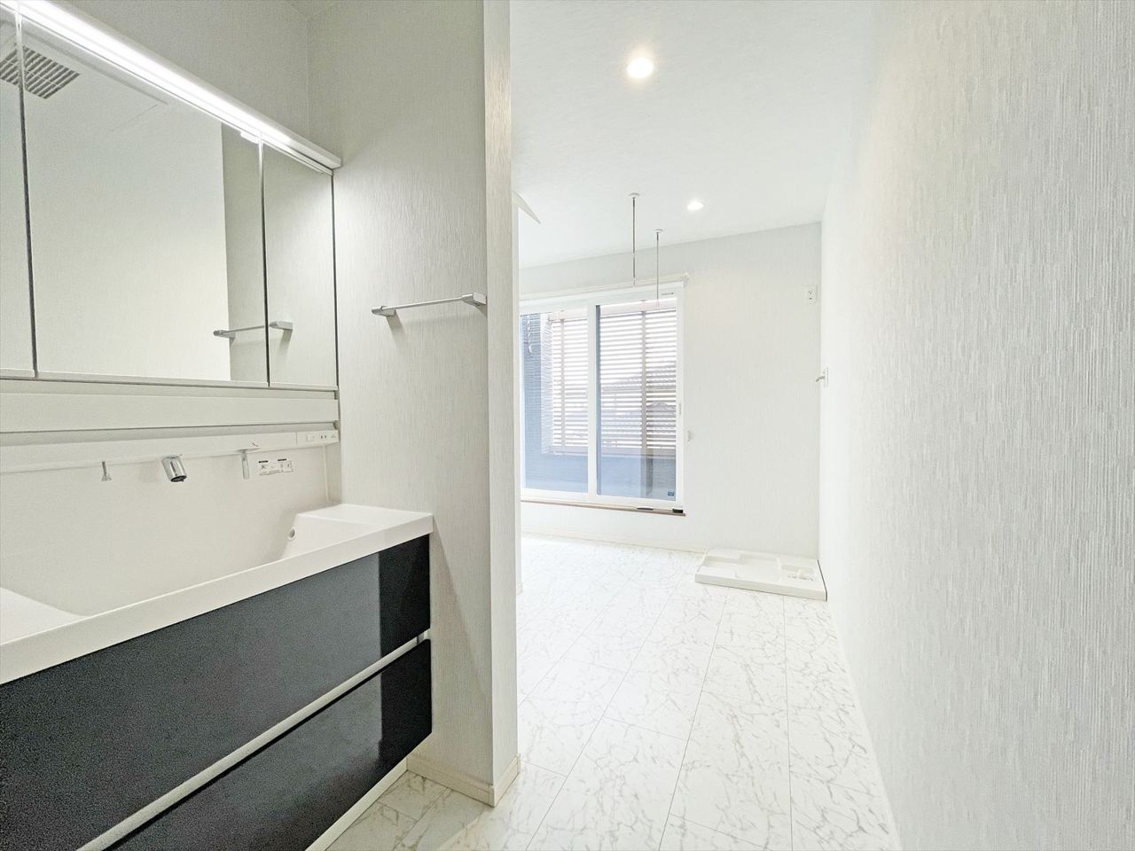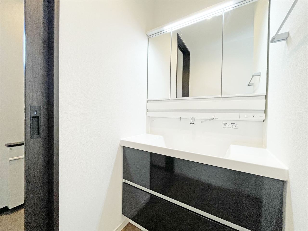 三面鏡にハンドシャワー付き、 使いやすい洗面台。