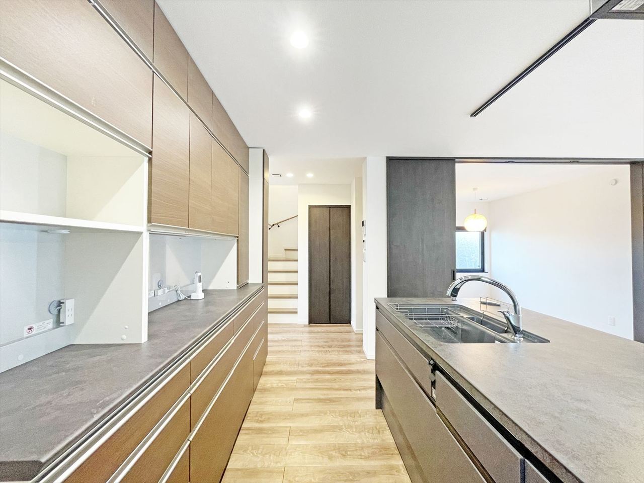 吊戸棚で視界を遮らず、パノラマ感を重視したタイプのキッチンスペース。