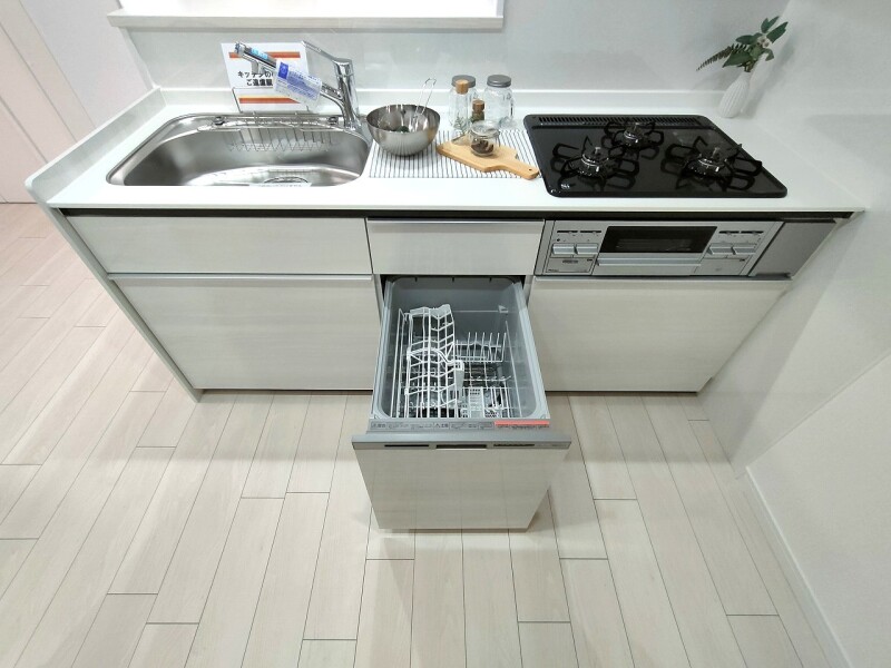 金物の反射がまぶしい新品のシンク。快適なお料理空間を演出します。