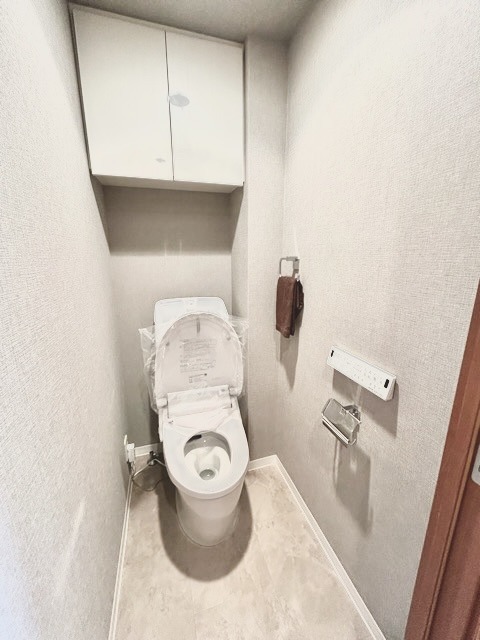 ウォシュレット機能付きのトイレ。収納もあり実用性も兼ね備えた造り。