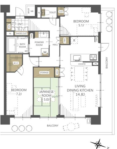 | 間取 | 3LDK (LDK14.8帖、洋室7.2帖、洋室5.1帖、和室5.0帖) | ||