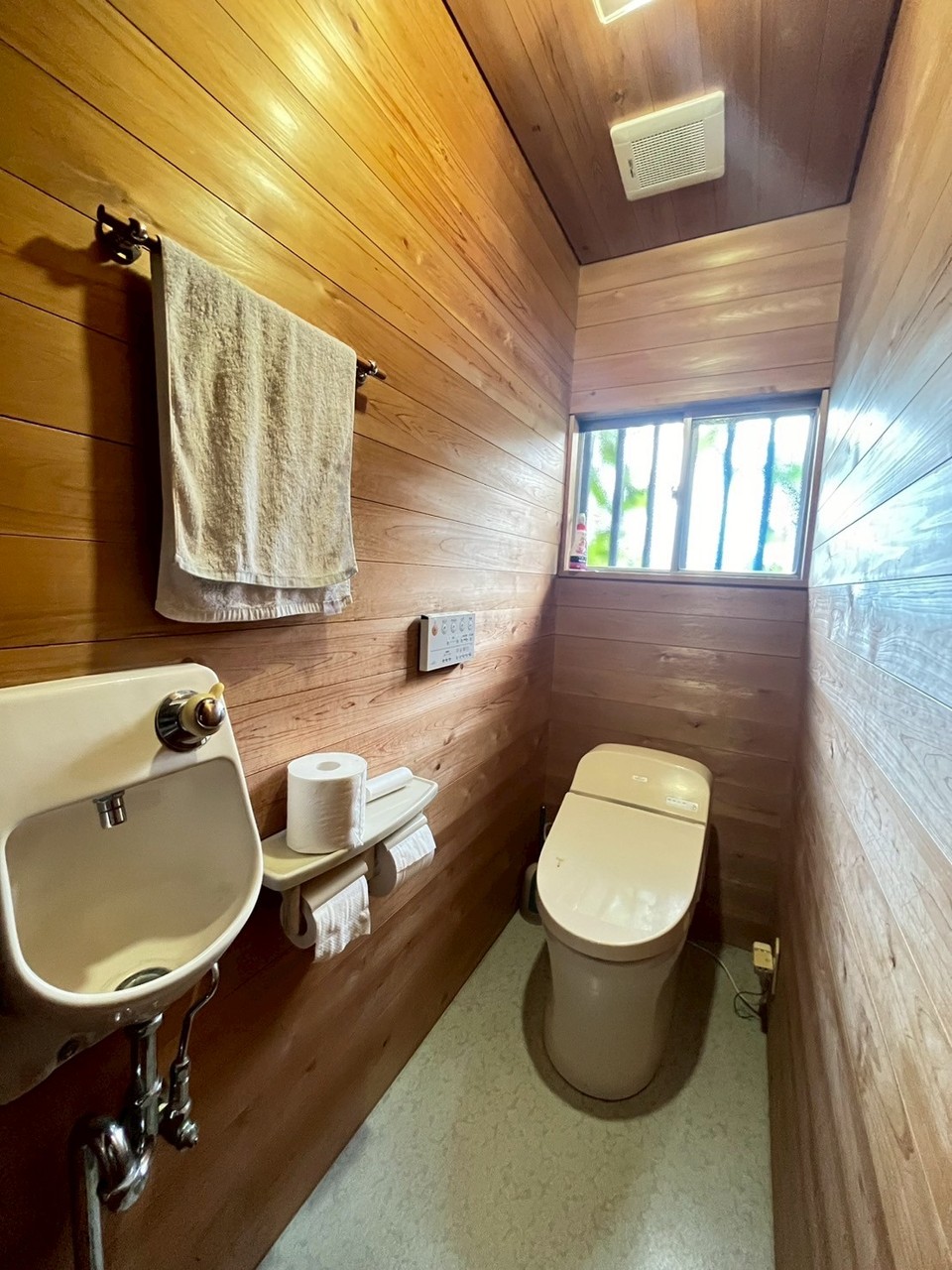 ウォシュレット機能付きのトイレ。換気のしやすい窓付きで、収納もあり実用性も兼ね備えた造り。