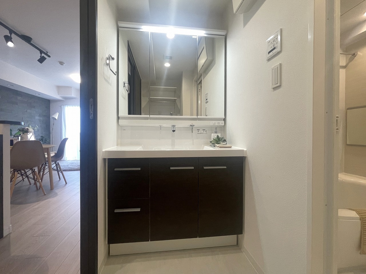 マンションならではの広く、鏡の大きな洗面化粧台。