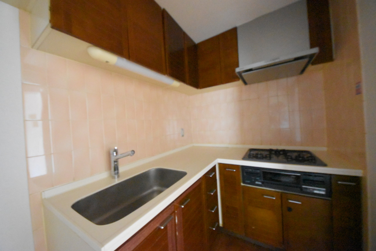 収納量豊富なシステムキッチン。明るい光が差し込む窓も調味料置き場などに役立ちます。カウンターキッチンと違い、背面を広く使えるので自由度が高いのも嬉しいですね。