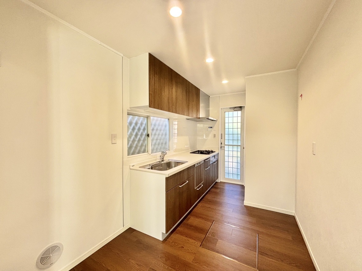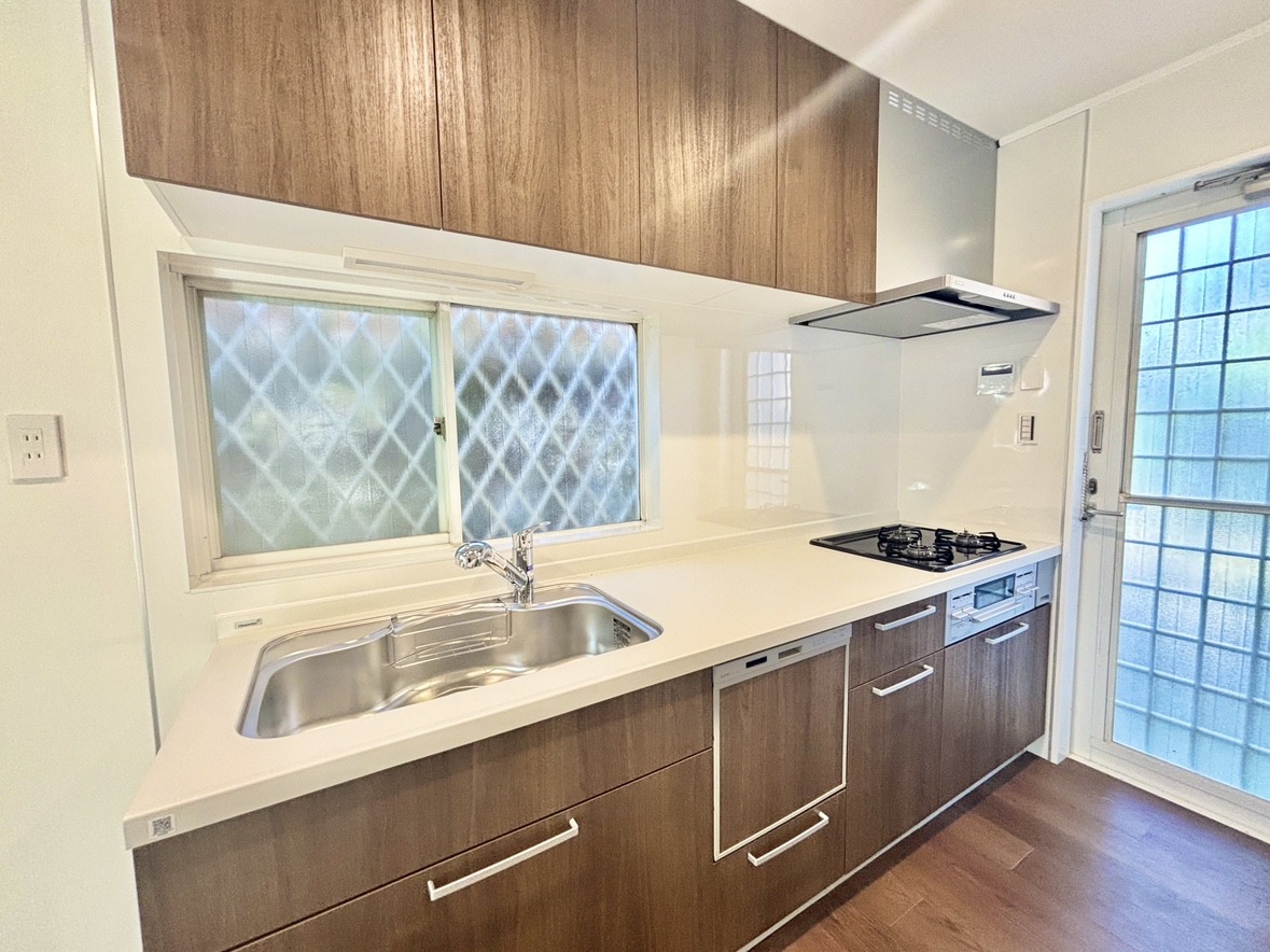 収納量豊富なシステムキッチン。明るい光が差し込む窓も調味料置き場などに役立ちます。カウンターキッチンと違い、背面を広く使えるので自由度が高いのも嬉しいですね。