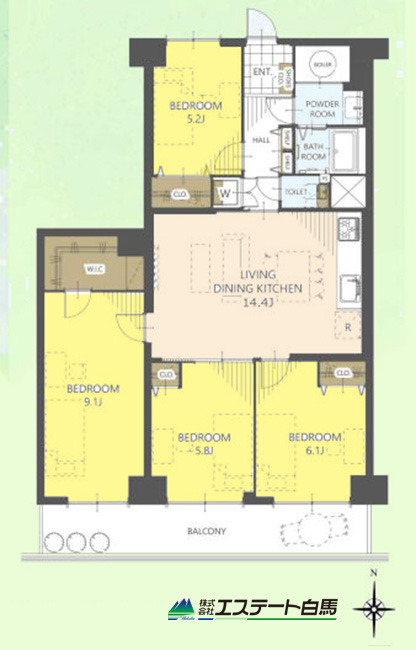 | 間取 | 4LDK (洋室9.1帖、洋室6.1帖、洋室5.8帖、洋室5.2帖、LDK14.4帖) | ||