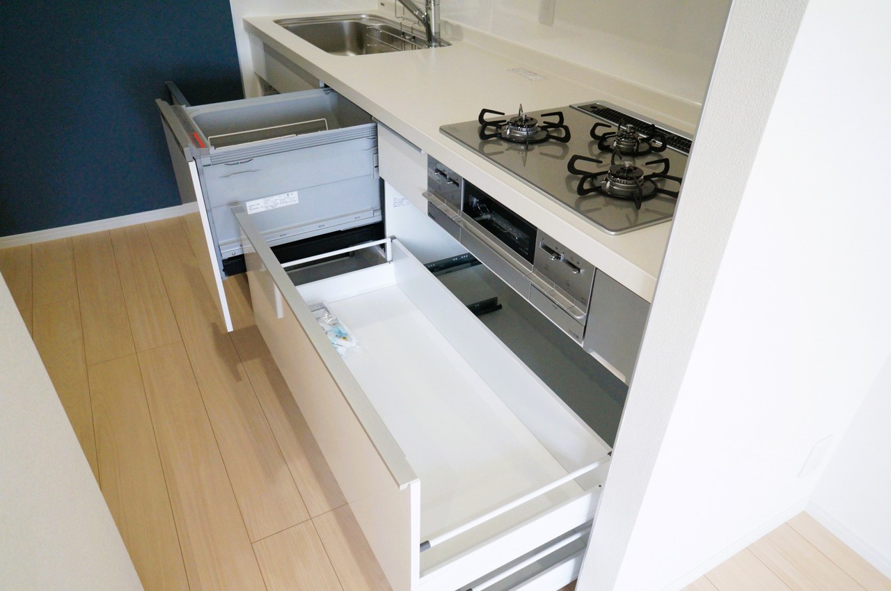 収納スライドをぐっと開けばお鍋や調味料をどんどんしまえる大収納。キッチンはいつもキレイ。