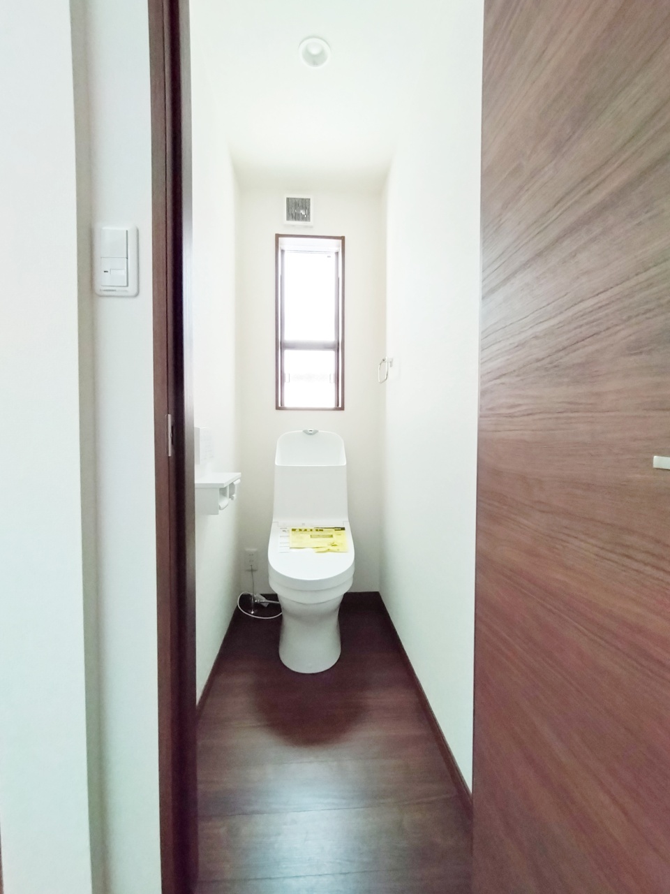 ウォシュレット機能付きのトイレ。換気のしやすい窓付きで、収納もあり実用性も兼ね備えた造り。