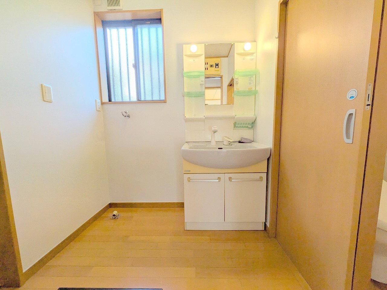 化粧台はやっぱり色が一番。シャワーヘッド付きの収納充実タイプです。