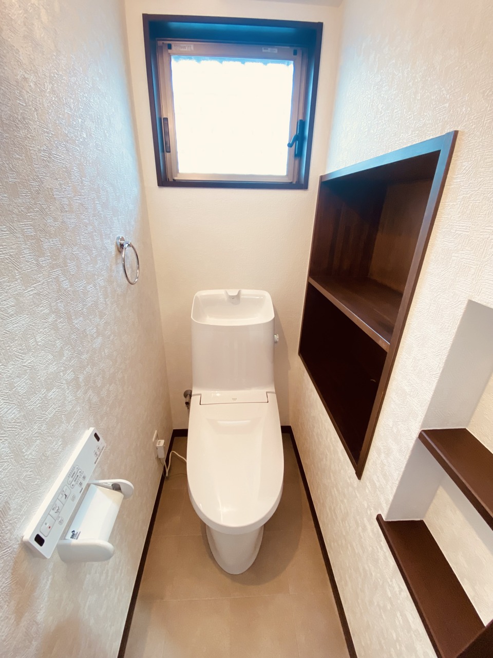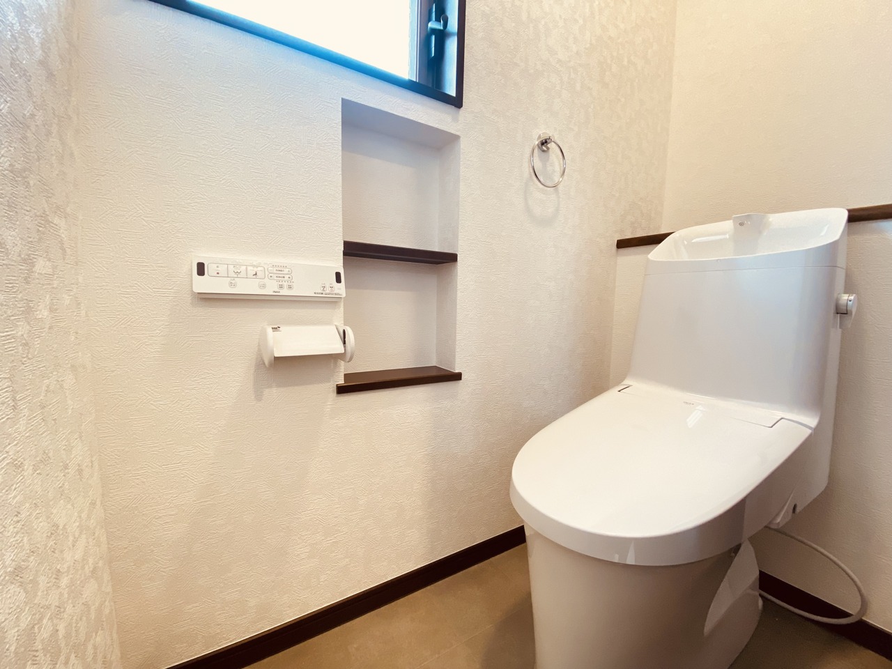 ウォシュレット機能付きのトイレ。換気のしやすい窓付きで、収納もあり実用性も兼ね備えた造り。
