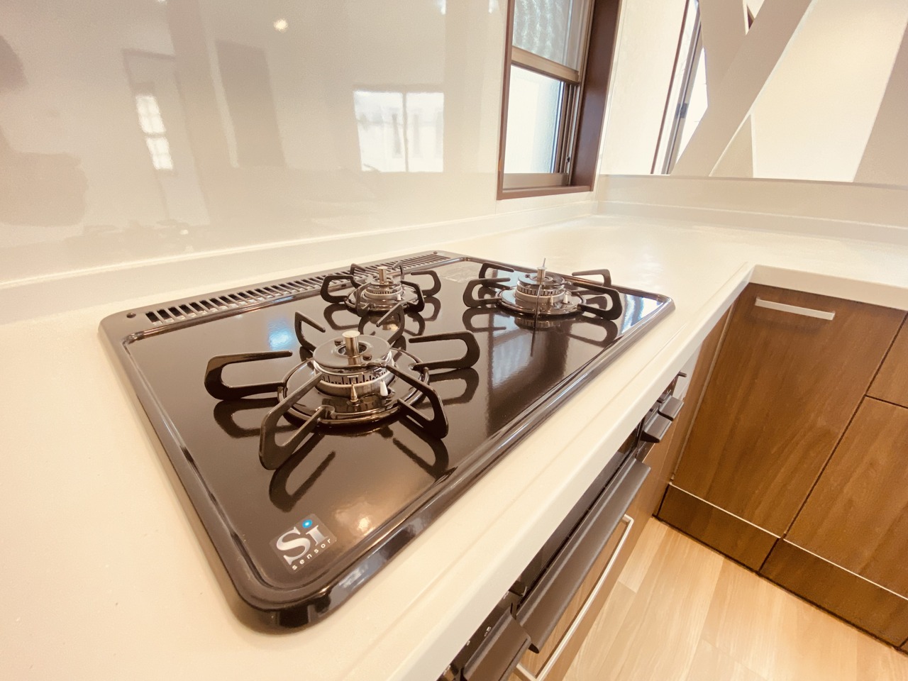 リビングにいる家族の顔が見渡せるカウンターキッチン。お料理もより一層おいしく、楽しく。食器棚を背面に設置しても十分な広さを確保しています。
