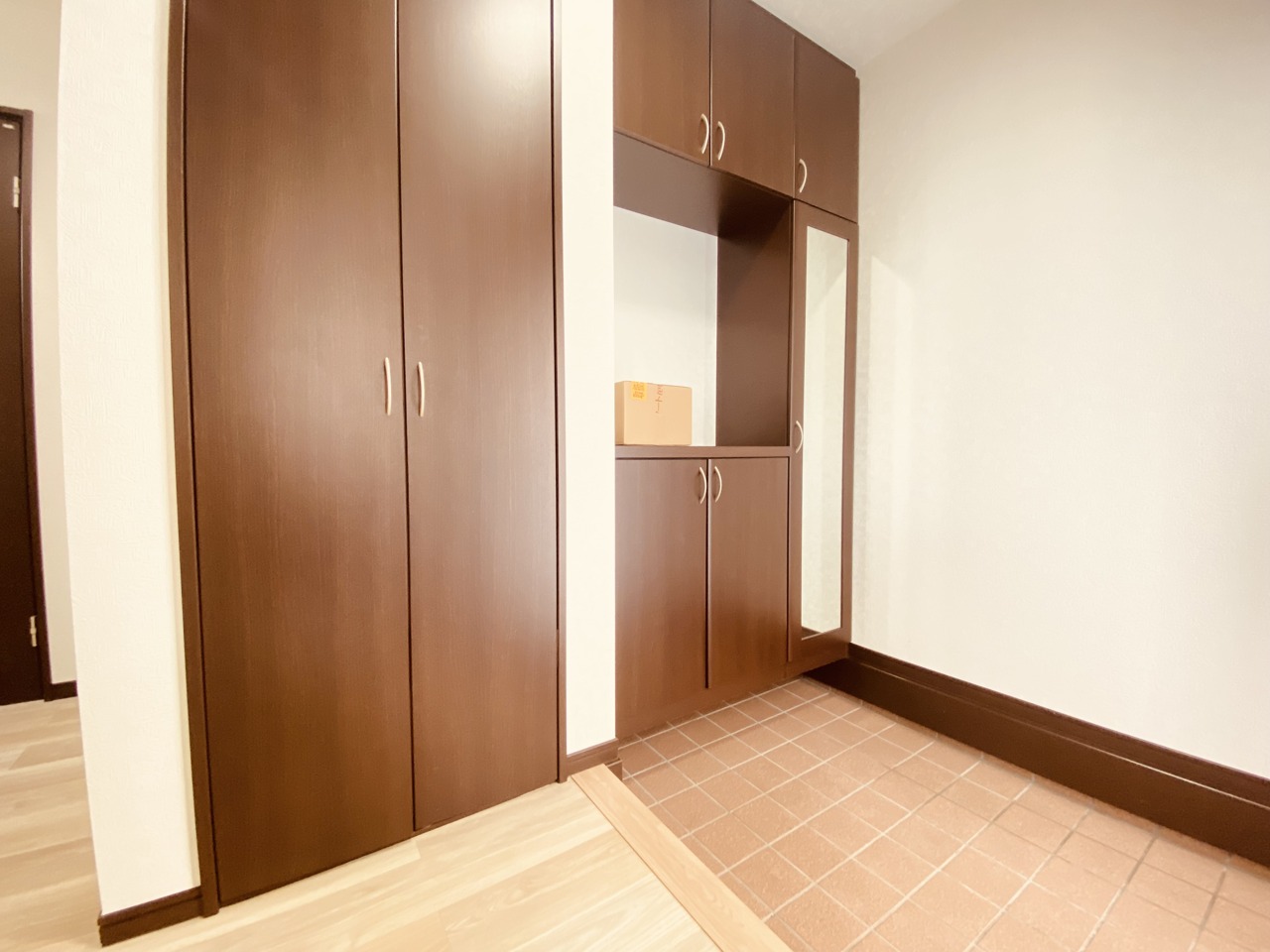お宅の顔となる明るく開放的な玄関。ご家族皆様様の靴を収納できるスペースと全身鏡があり、お出掛け前に身だしなみチェックもできます。