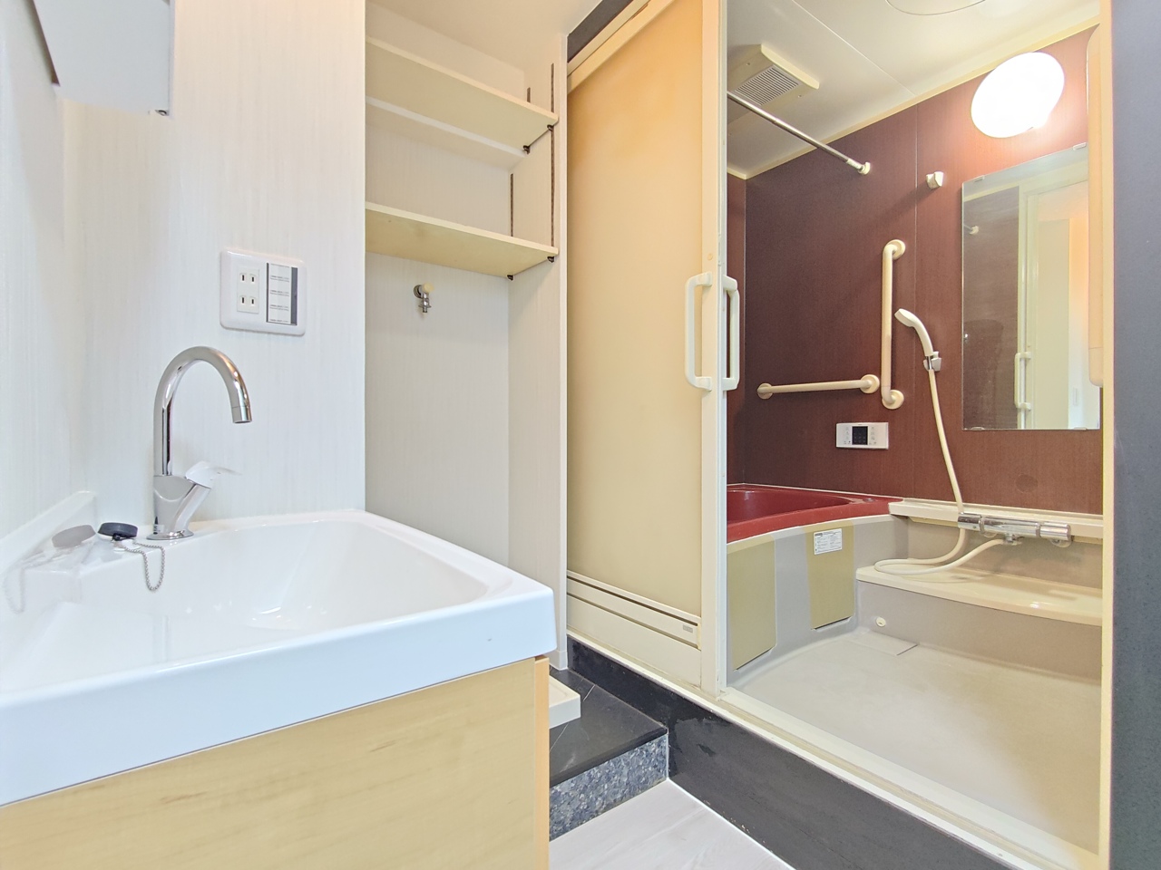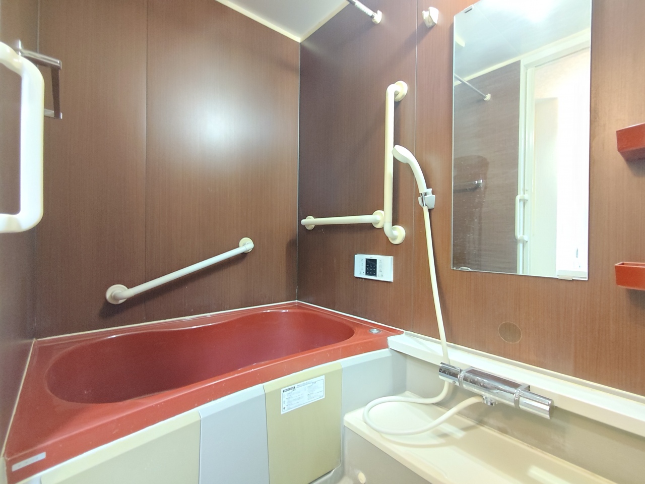 便利な浴室暖房乾燥機付きのシステムバス。 安心の手すり付き。