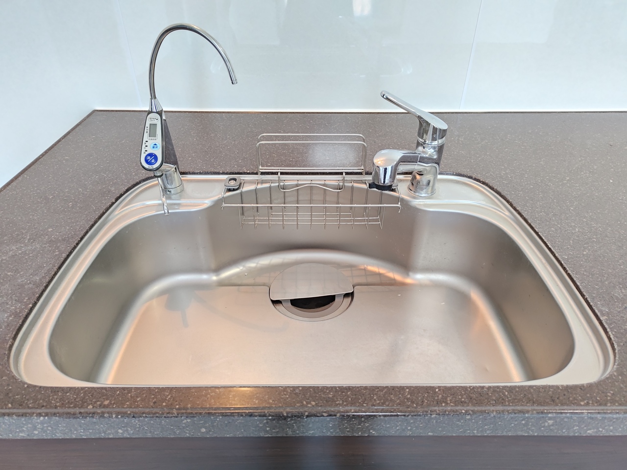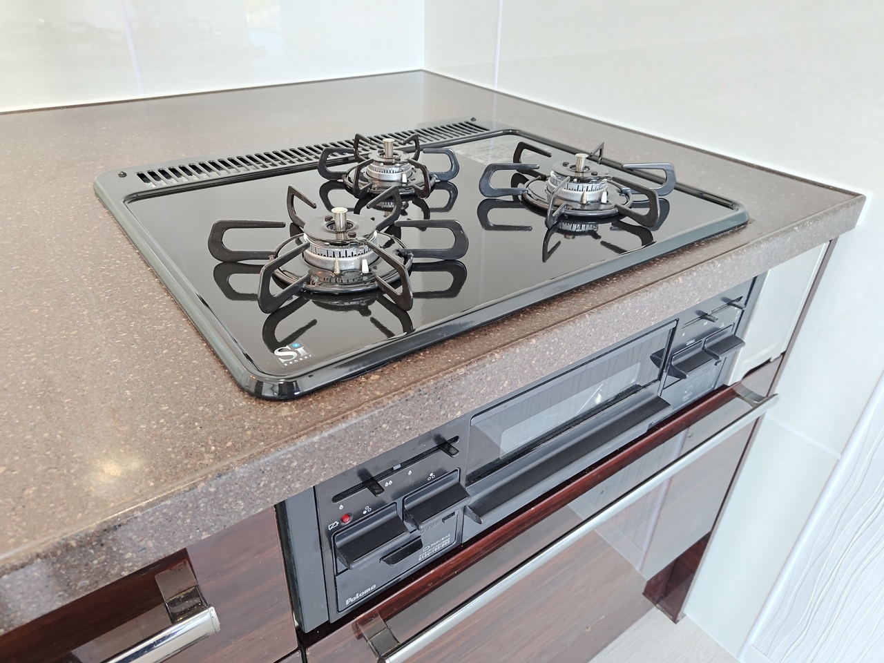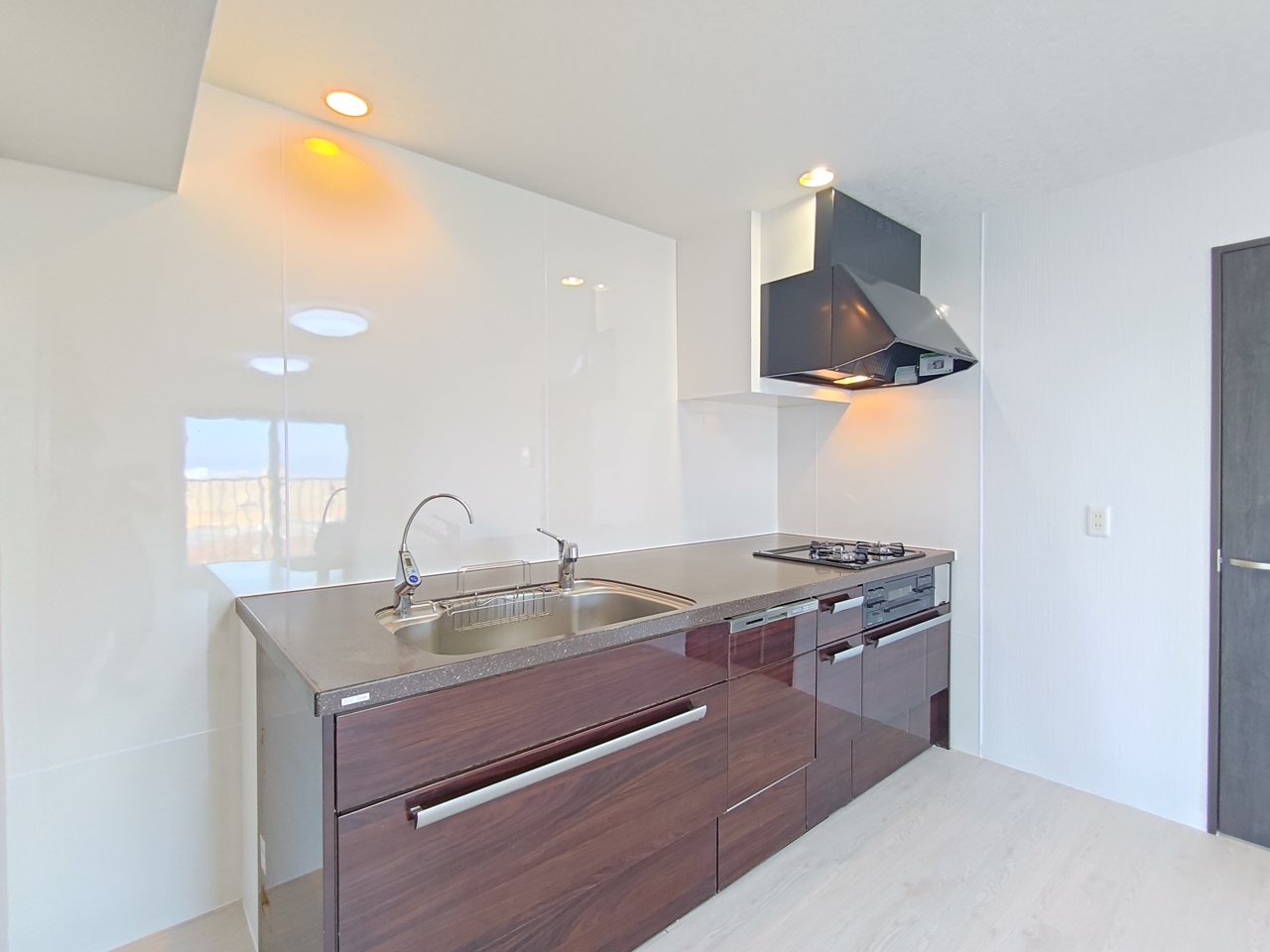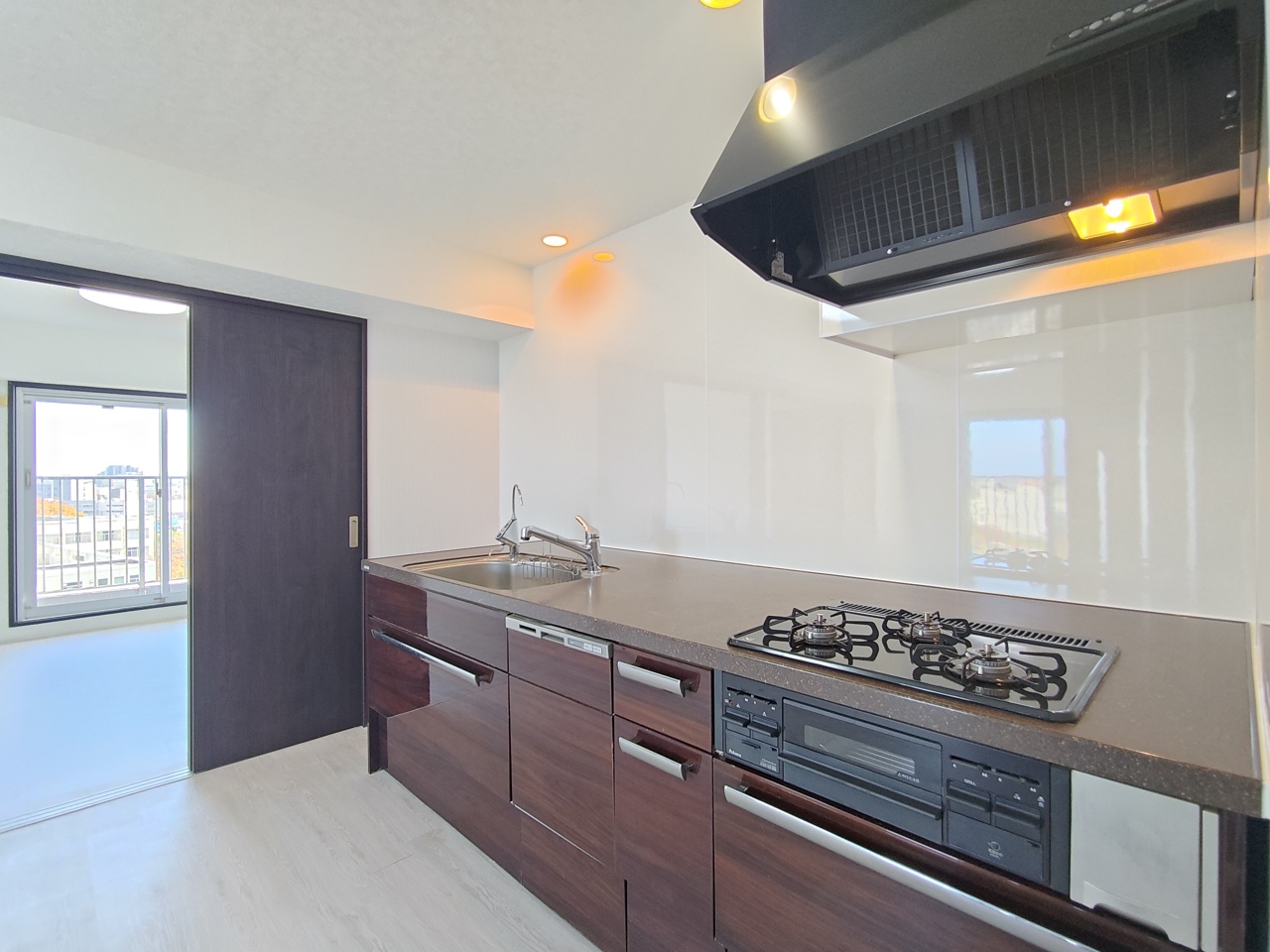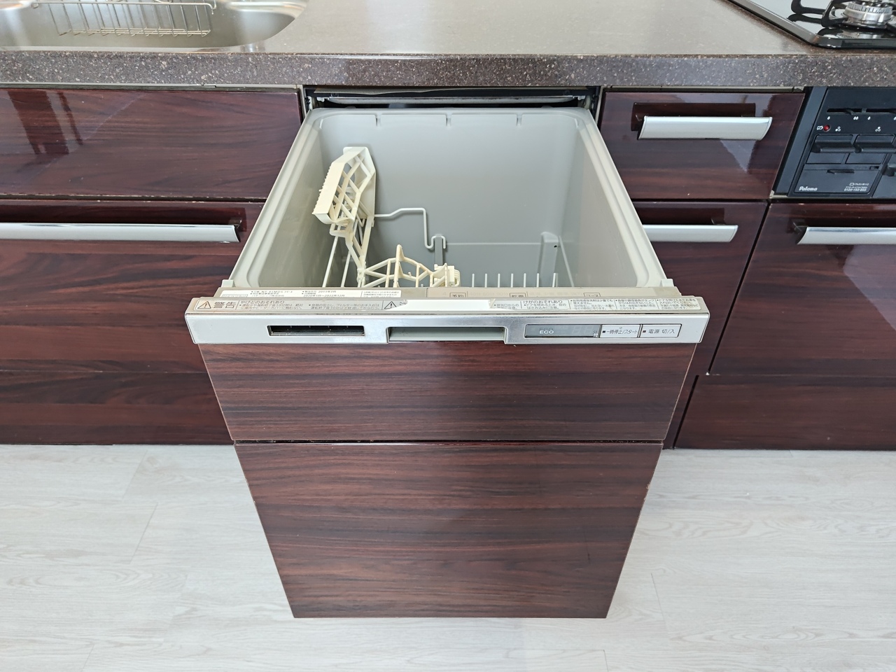 壁付けの新品システムキッチン。便利なビルトイン食洗器付きです。