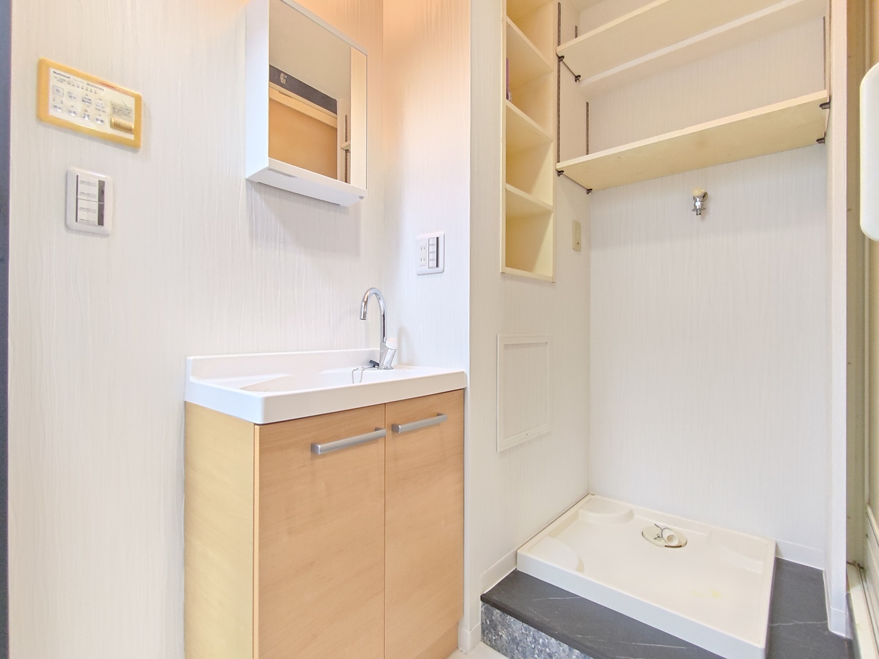 収納付きの洗面化粧台。鏡の裏側も収納棚になっています。