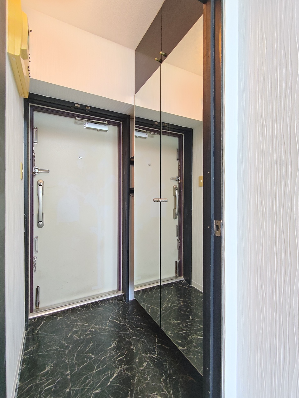 大きな靴棚を配した玄関ホール。 靴棚に設置した姿見鏡はお出かけ前の身だしなみチェックにお役立てください!