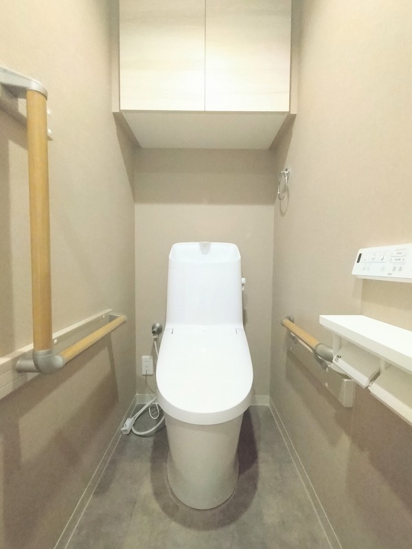 ウォシュレット機能付きのトイレ。収納もあり実用性も兼ね備えた造り。