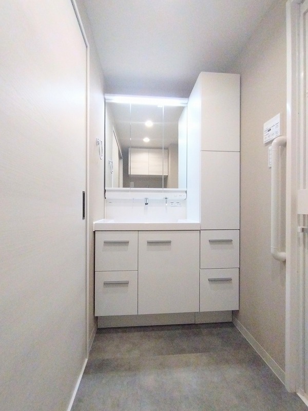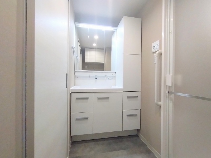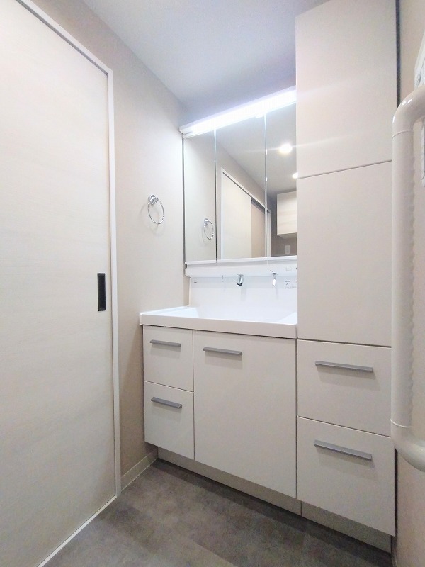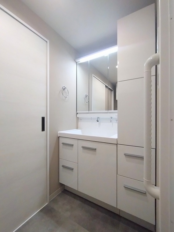 ゆとりの洗面スペースで朝の身支度もスムーズに行えます。お出かけ前の身だしなみに一歩差がつく三面鏡。ミラー裏にはたっぷり収納もございます。