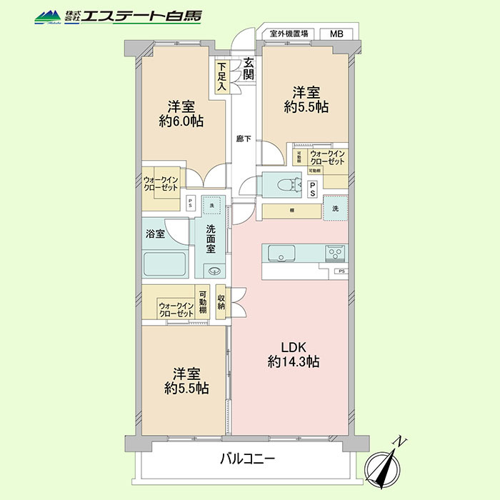 | 間取 | 3LDK (LDK14.3帖、洋室6帖、洋室5.5帖、洋室5.5帖) | ||