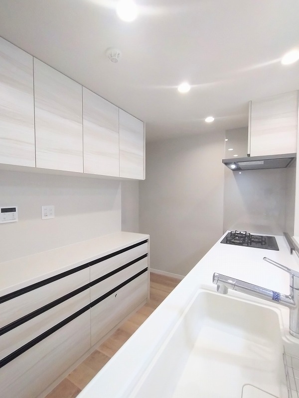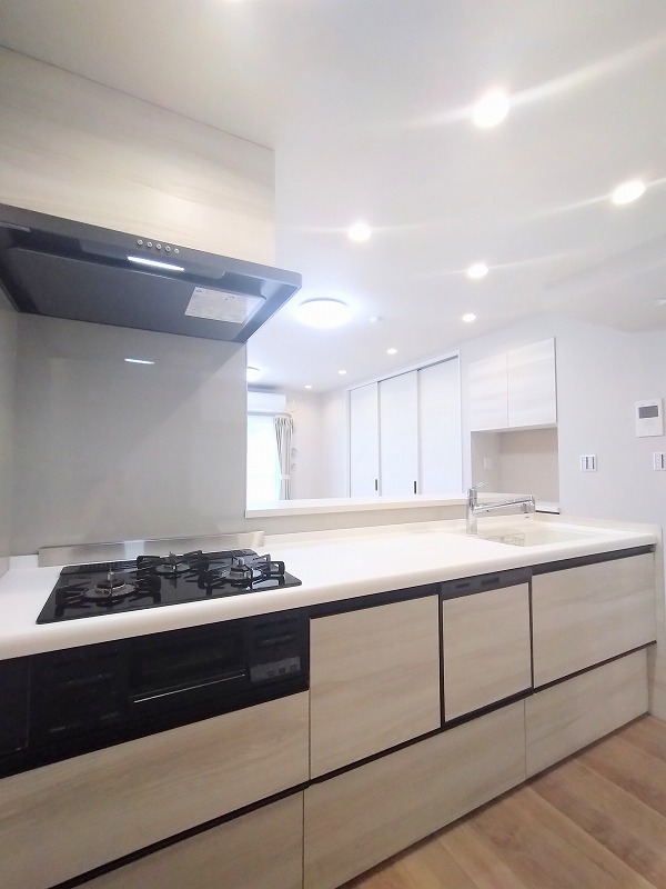 人工大理石を使用したシステムキッチン。永く傷つきにくく、お手入れもしやすい高機能性です。