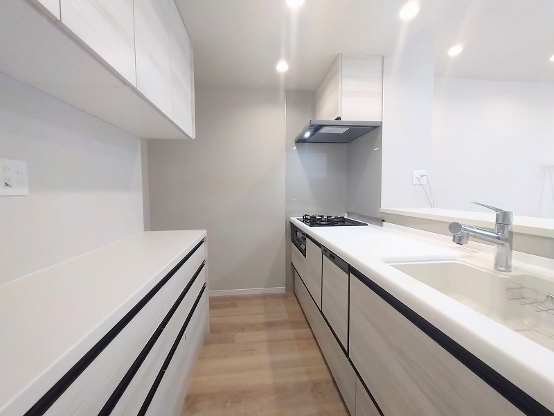 リビングにいる家族の顔が見渡せるカウンターキッチン。お料理もより一層おいしく、楽しく。食器棚を背面に設置しても十分な広さを確保しています。