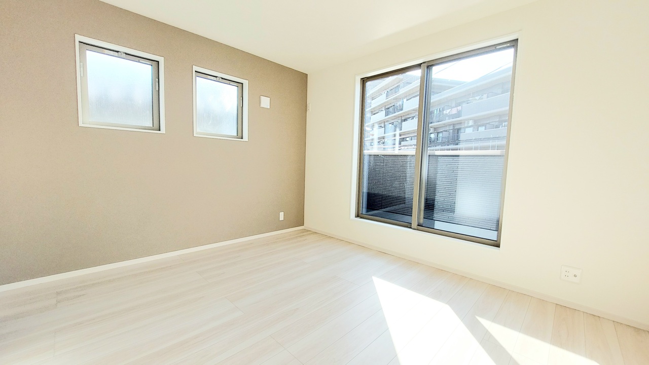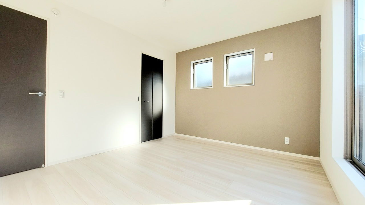 アクセントクロスを使用したオシャレな洋室。窓からそそぐ陽の光が眩しいベッドルームは、朝の目覚めが心地良く迎えられそうです。