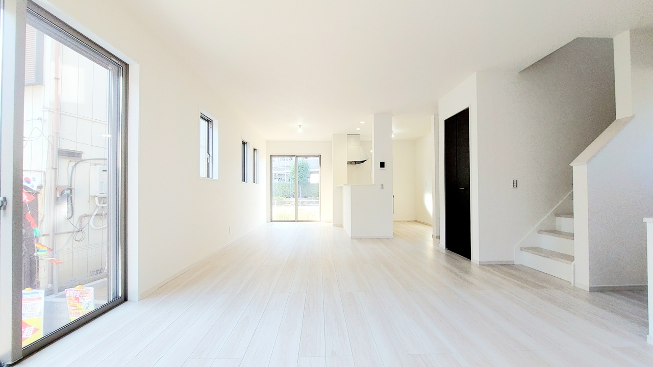 家族や友人、両親、親戚とこれから沢山の時間を紡ぐのだろう。そこを彩るのは窓から見える青い空、心地よい緑。そんなイメージが膨らむリビングスペース。