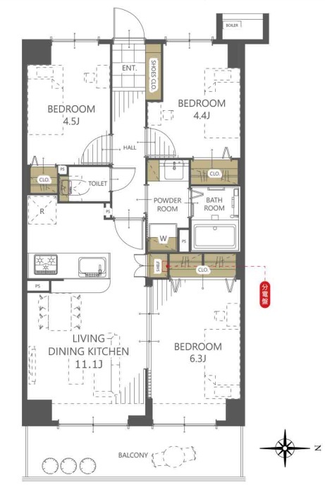 | 間取 | 3LDK (洋室6.3帖、洋室4.5帖、洋室4.4帖、LDK11.1帖) | ||