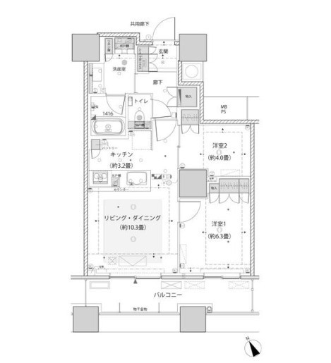 | 間取 | 2LDK (LD10.3帖、K3.2帖、洋室6.3帖、洋室4帖) | ||