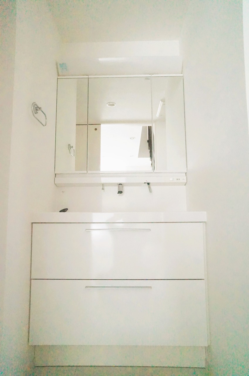 化粧台はやっぱり色が一番。シャワーヘッド付きの収納充実タイプです。