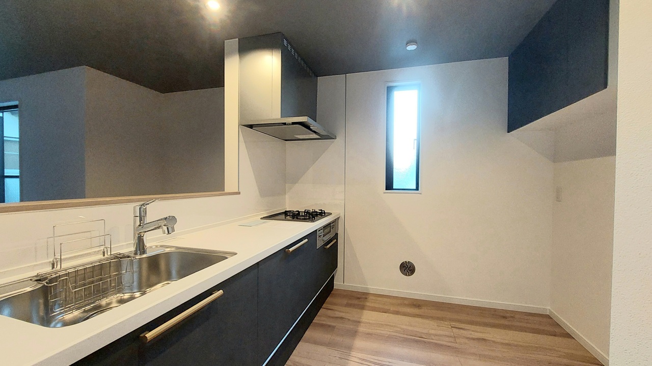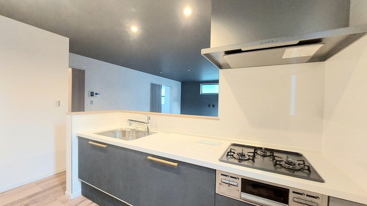 リビングにいる家族の顔が見渡せるカウンターキッチン。お料理もより一層おいしく、楽しく。食器棚を背面に設置しても十分な広さを確保しています。